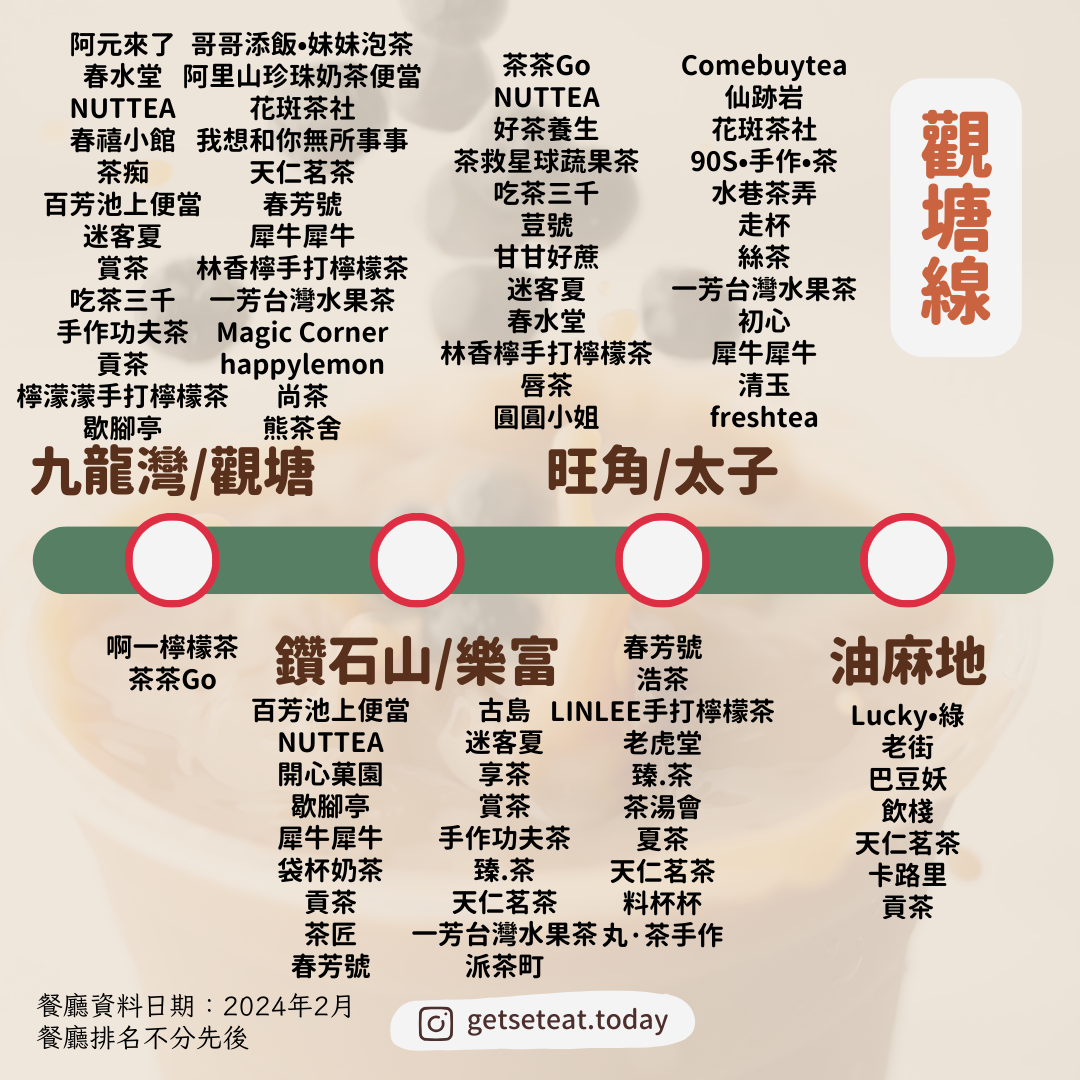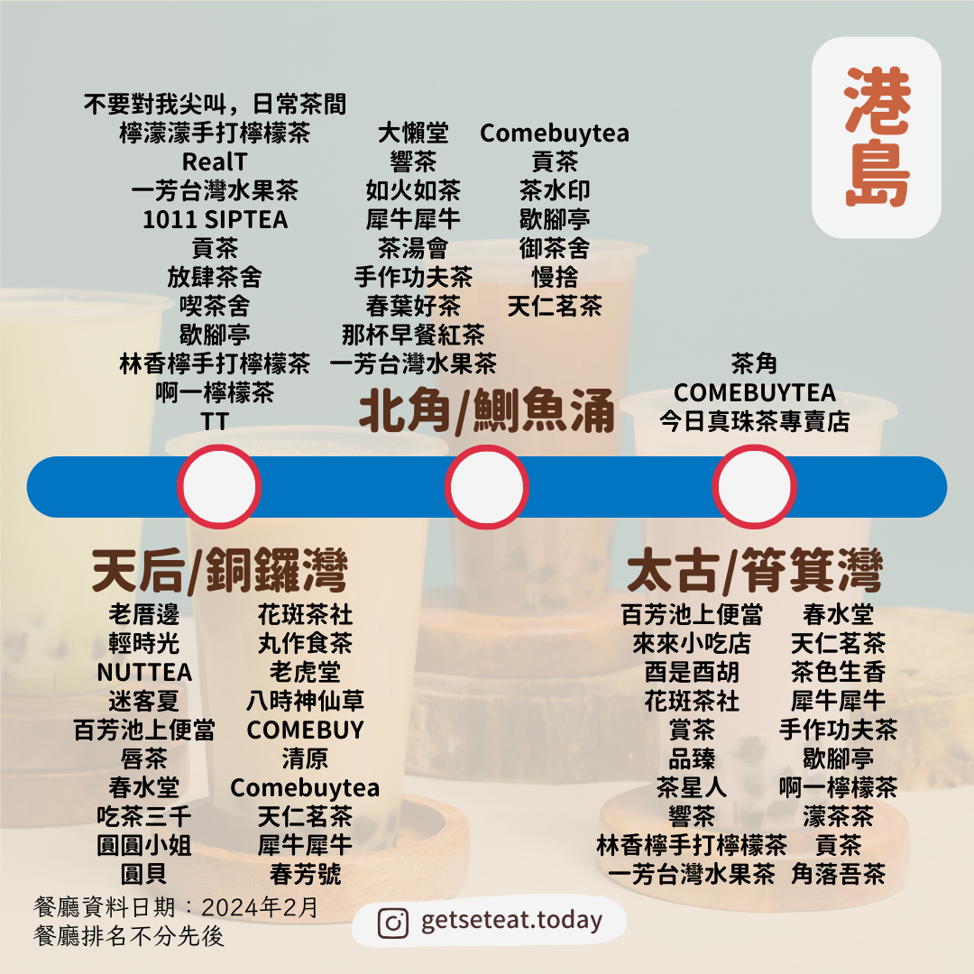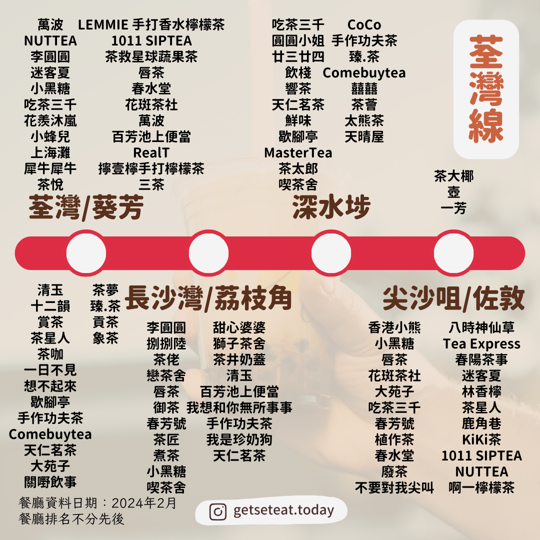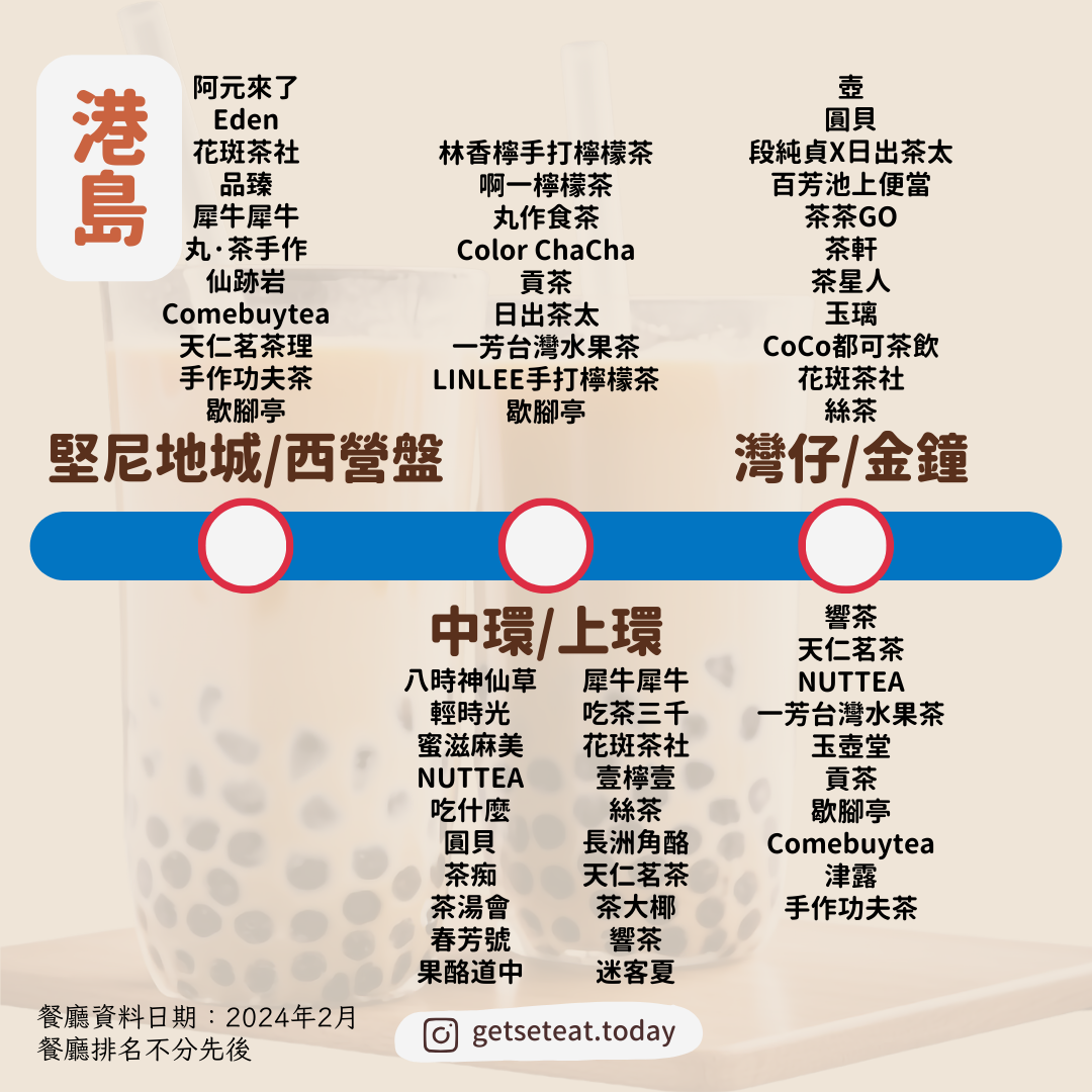 | 灣仔/金鐘 | 壺 圓貝 段純貞X日出茶太 百芳池上便當 茶茶GO 茶軒 茶星人 玉璃 CoCo都可茶飲 花斑茶社 絲茶 |