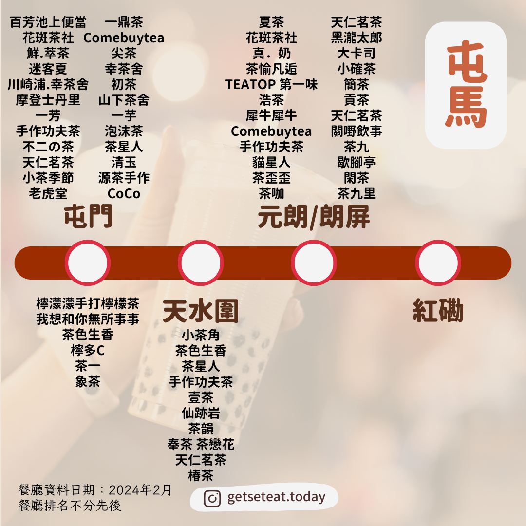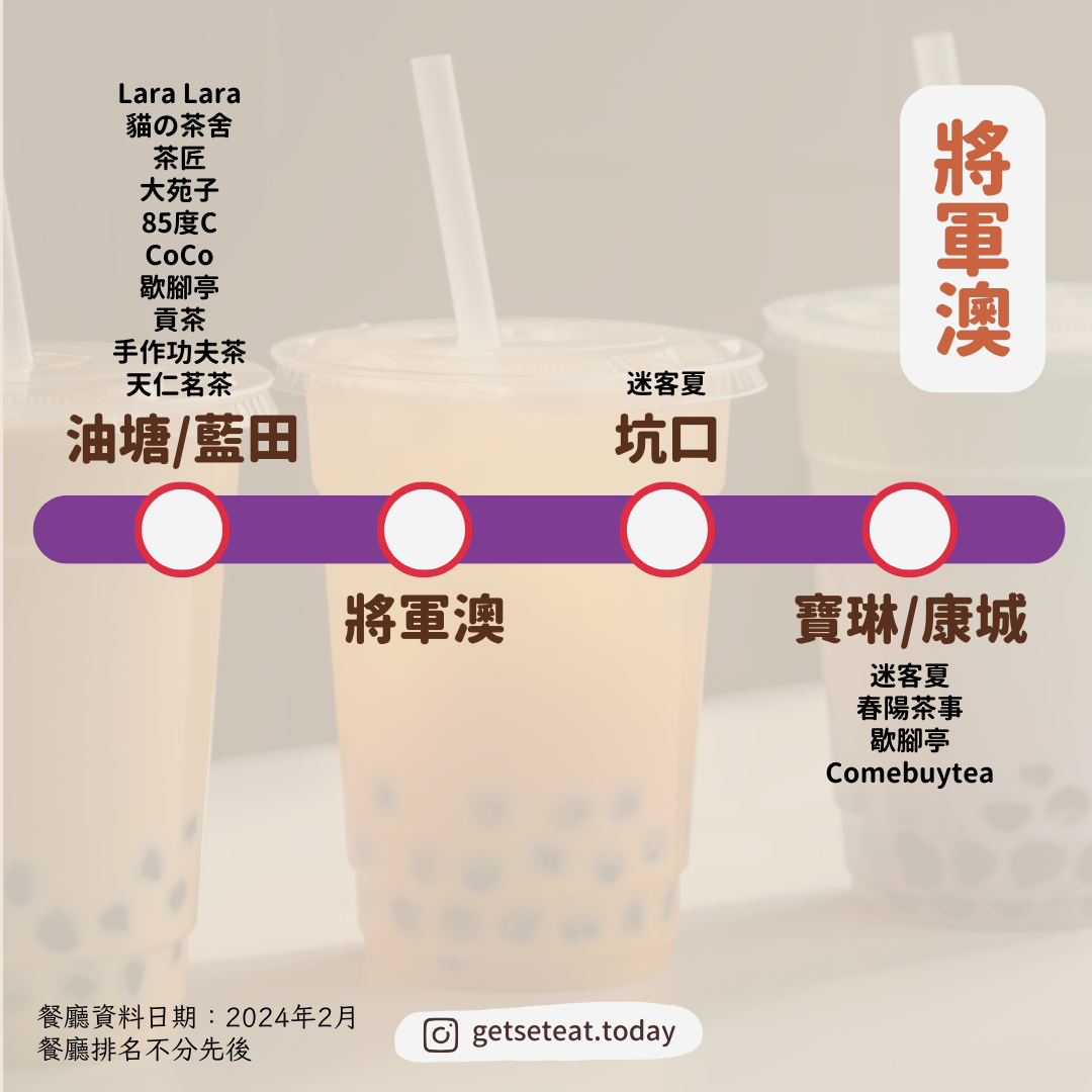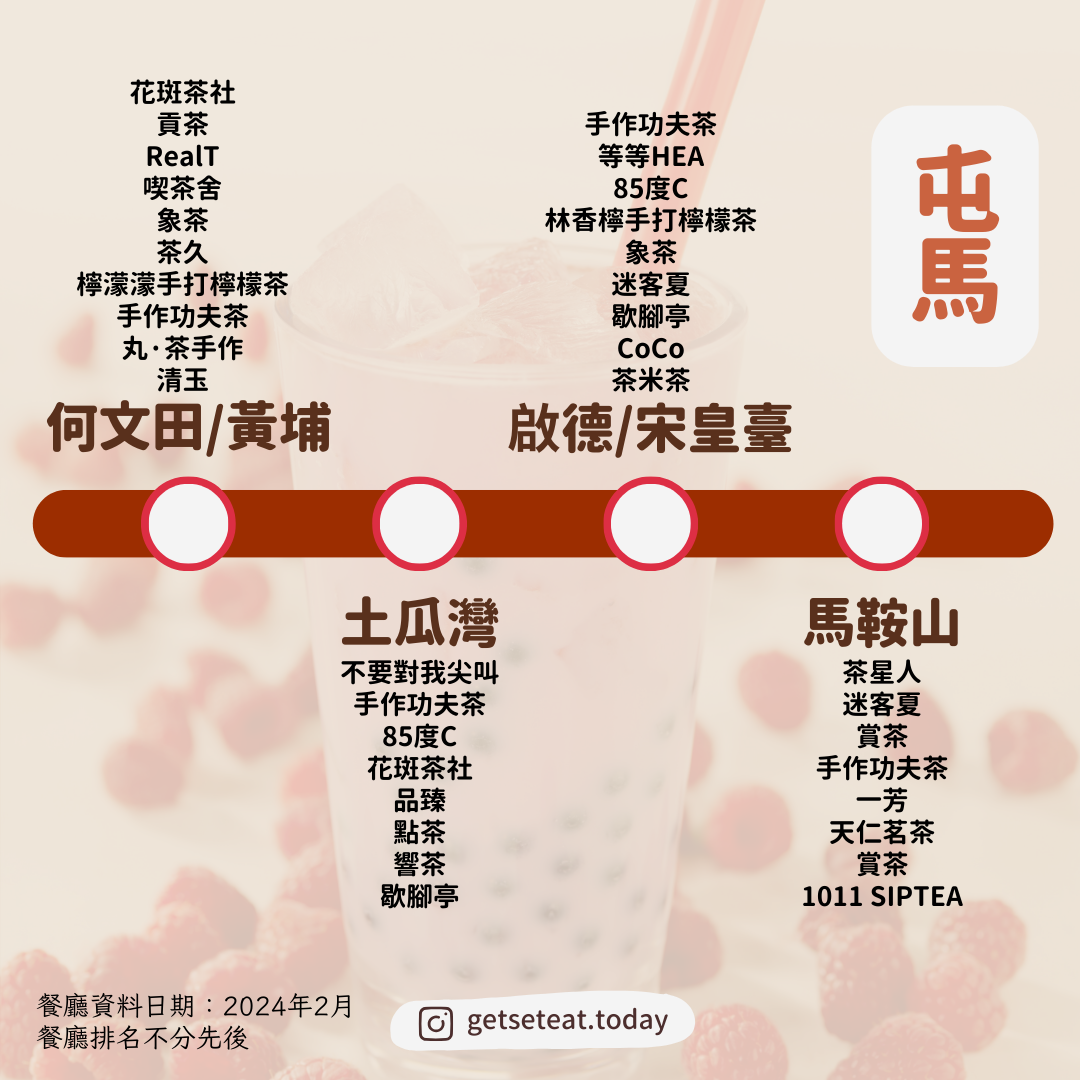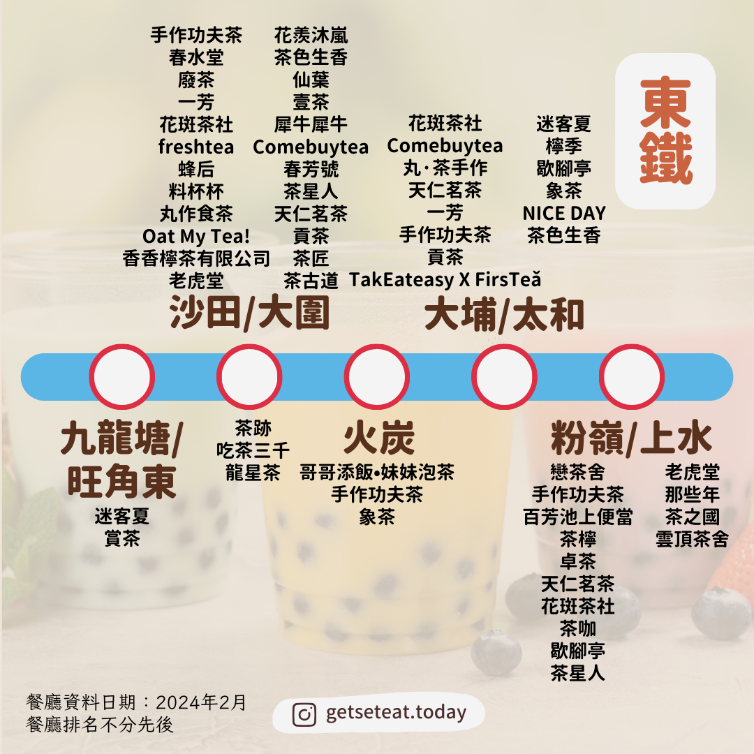 | 灣仔/金鐘 | 壺 圓貝 段純貞X日出茶太 百芳池上便當 茶茶GO 茶軒 茶星人 玉璃 CoCo都可茶飲 花斑茶社 絲茶 |