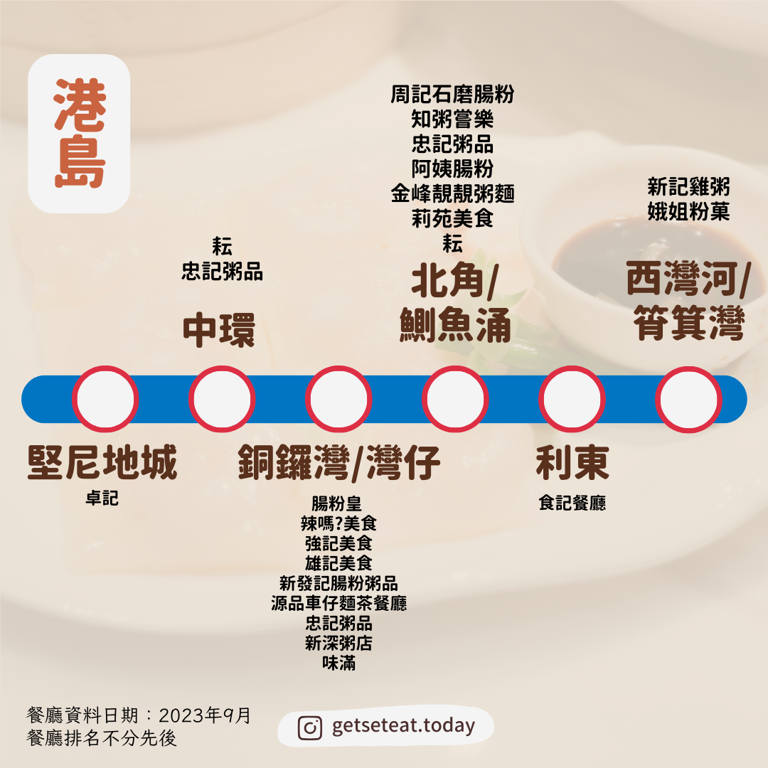 | 銅鑼灣/灣仔 | 腸粉皇 辣嗎?美食 強記美食 雄記美食 新發記腸粉粥品 源品車仔麵茶餐廳 忠記粥品 新深粥店 味滿 |