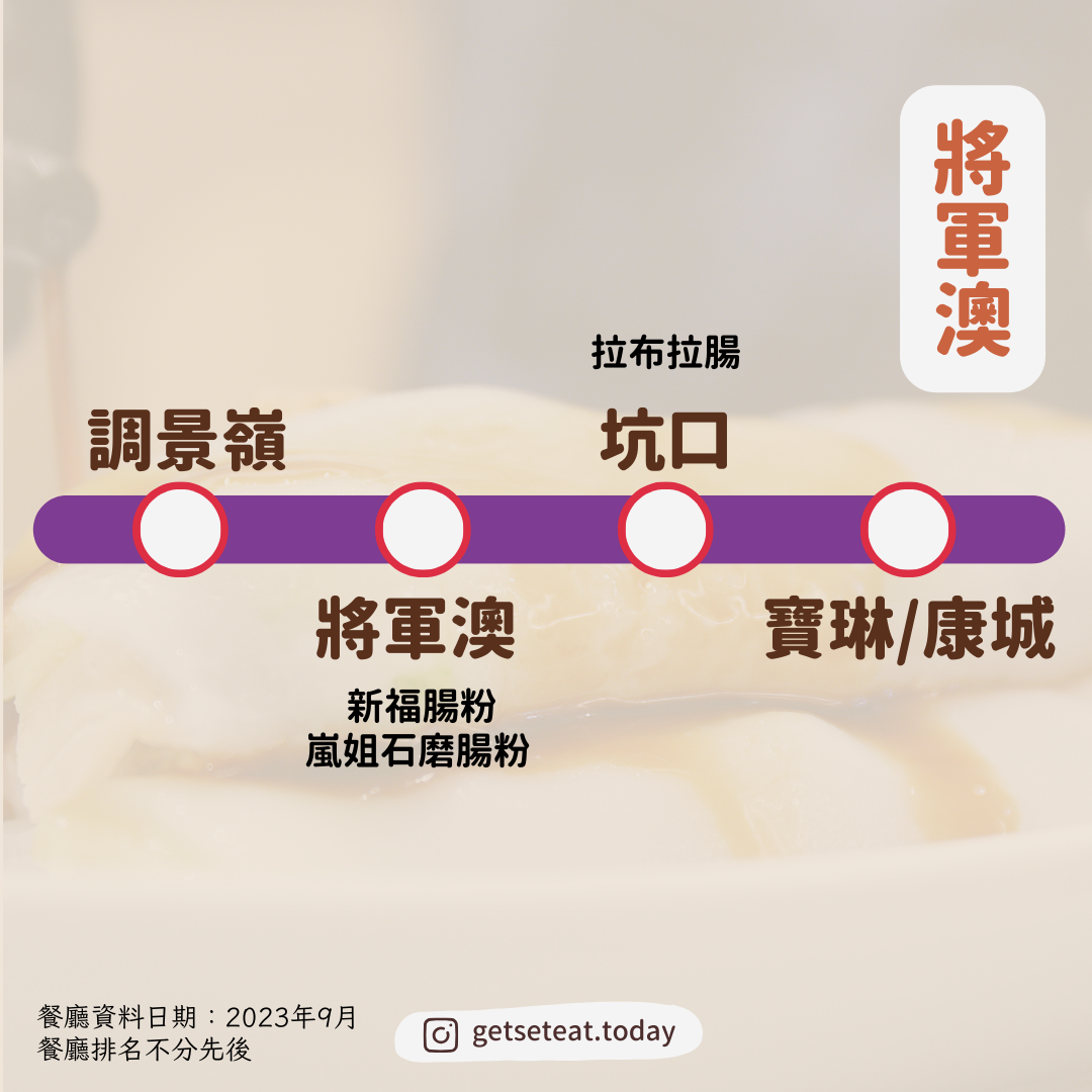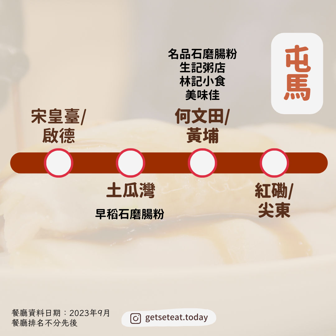| 尖沙咀/ 佐敦 | 舊時光石磨腸粉 濃姐石磨腸粉 元朗新記 新大光燈 新光粥店 盛記粥麵 |