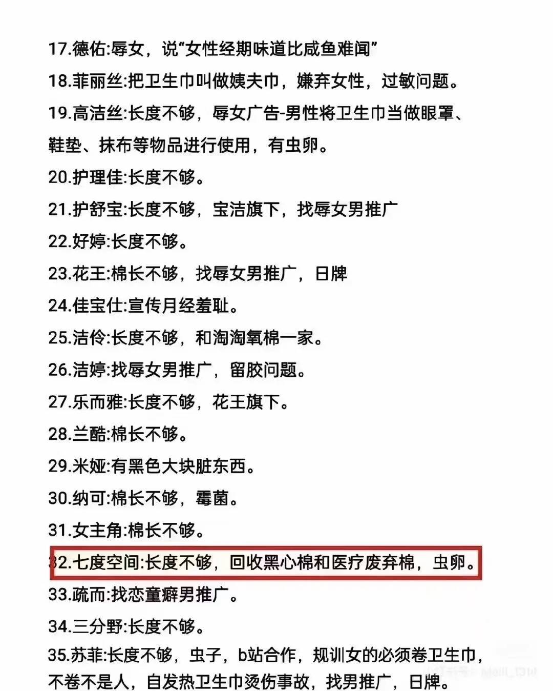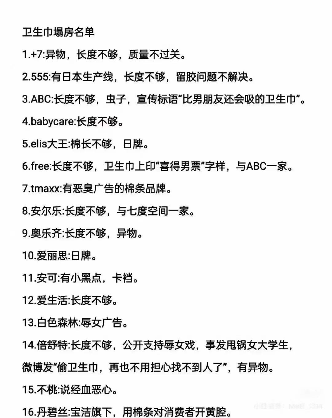 其中一款 ABC 衛生巾內甚至發現有小蟲蟲、七度空間衛生巾用回收黑心、醫療廢棄棉及有蟲卵,都幾噁心!一共涉及 56 個品牌,由於品牌數量太多因而被網民稱為「衛生巾集體塌方」,國內的女性更加崩潰!