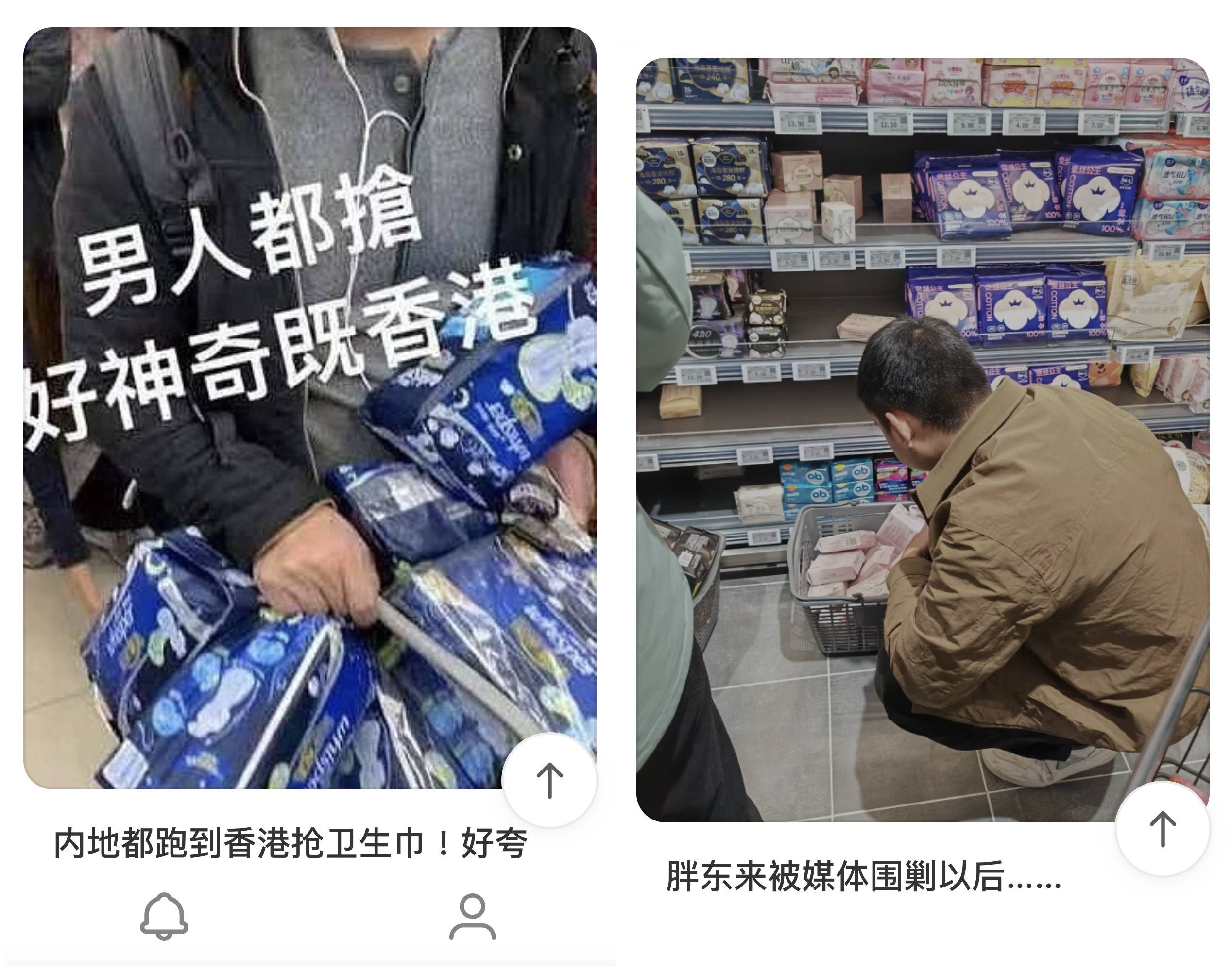 衛生巾是女士們貼身用品,驚恐也無可厚非,有小紅書博主把握危機來締造商機,大量香港、日本、韓國衛生巾代購在小紅書等平台出現。近日香港的超市、百貨衛生用品貨架雖未至清空,但有不少網民都影到有人大喼大喼地瘋購衛生巾,部分香港女性也人心惶惶,紛紛都入定幾包看門口以求安心!連國內網友都不禁說諷刺說:「男人都搶(衛生巾),好神奇嘅香港!」