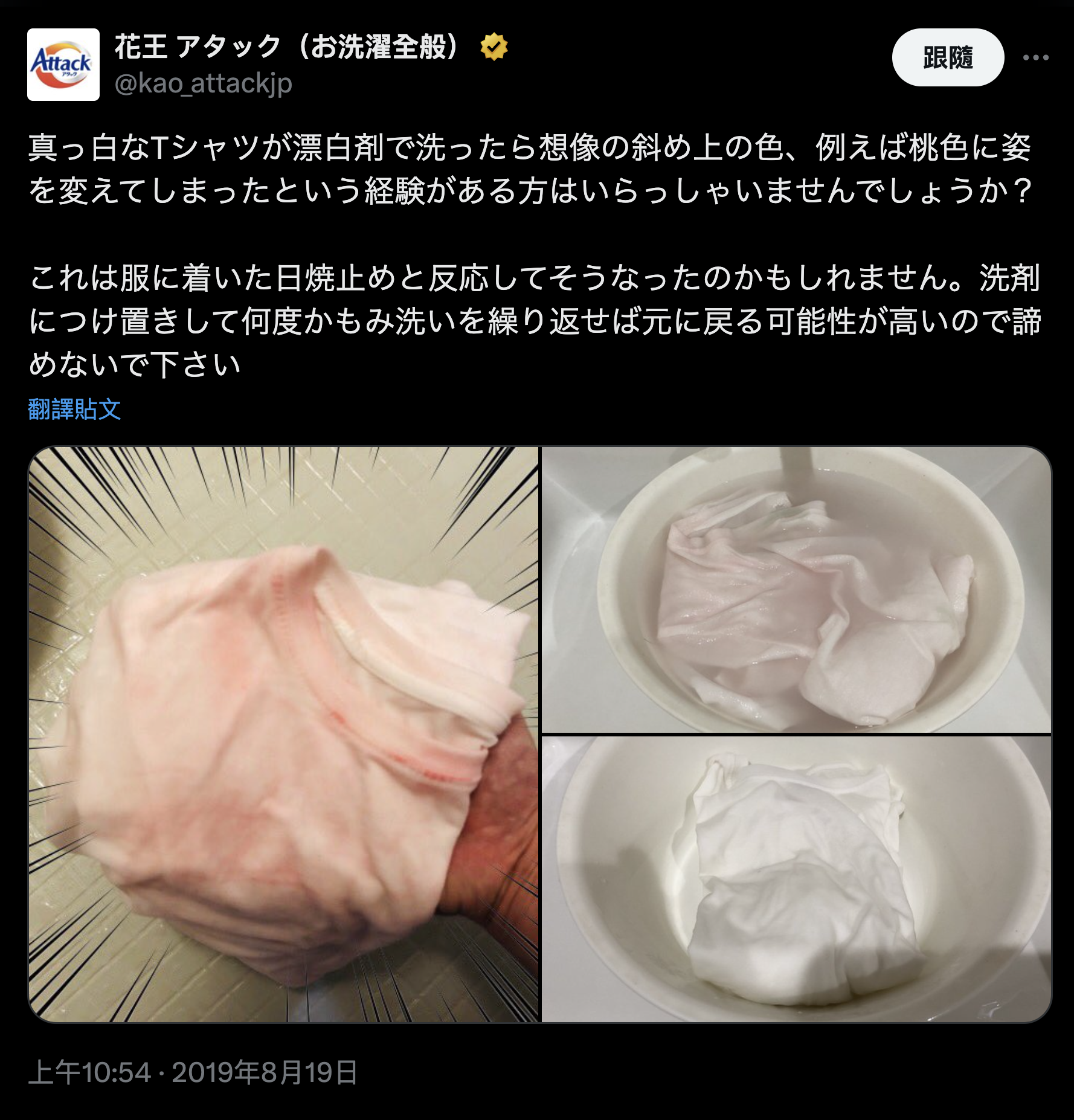 白 Tee 漂完染上淡粉紅色|多次沖洗