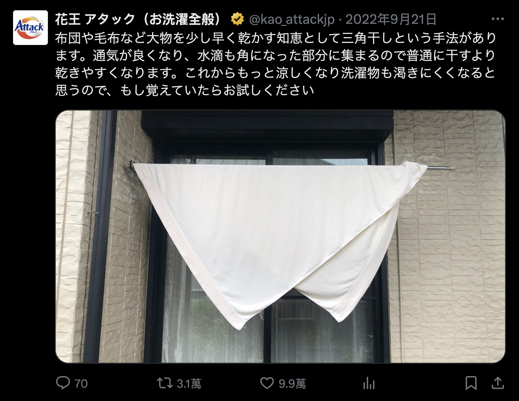 香港住宅面積細,不少家居都缺乏晒晾衣服的地方,還有不少住宅只配備黑廁,唔係衣物好難乾,就是晾足幾日先乾,令衣服一陣罨味,晾衫喺香港是一門學問!日本洗衣液花王 Attack 在官方的 X(前稱 Twitter)發表推文,教大家對住香港家居難以晾乾的被、厚毛巾、床單或地氈等,愛穿白 Tee 的品牌亦分享漂衣小知識。
