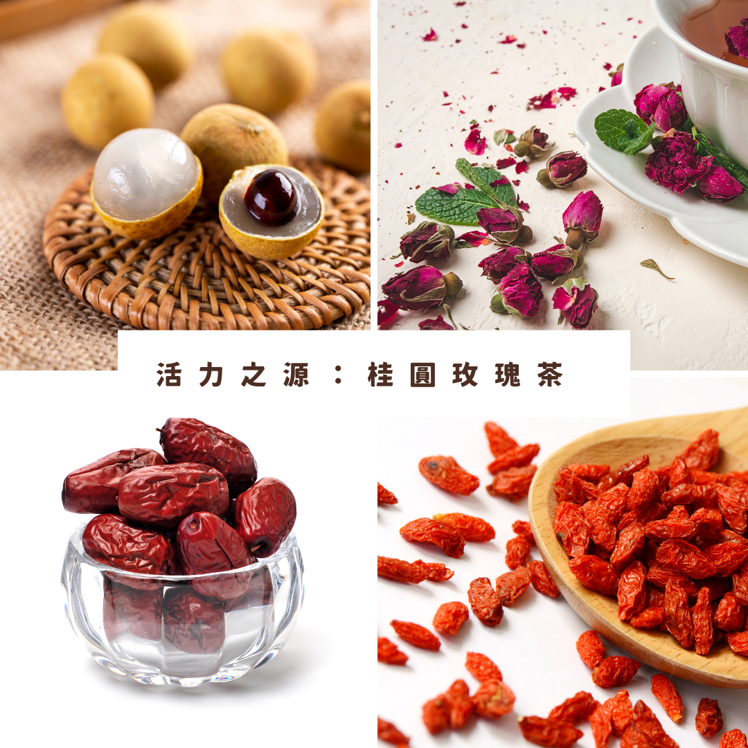 🍹 製作:精選桂圓8顆,搭配玫瑰5朵,紅棗4顆,以及枸杞10顆。
