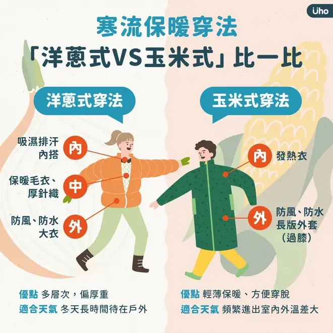 洋蔥式穿法的優點在於其系統性,能夠應對多種環境,但缺點是衣物較多,穿脫稍顯不便。而玉米式穿法雖然簡單易穿脫,但保暖層和功能性相對不足。洋蔥式穿法適用於登山、出國旅遊等情境,而玉米式穿法則更適合騎車、日常通勤和兒童。