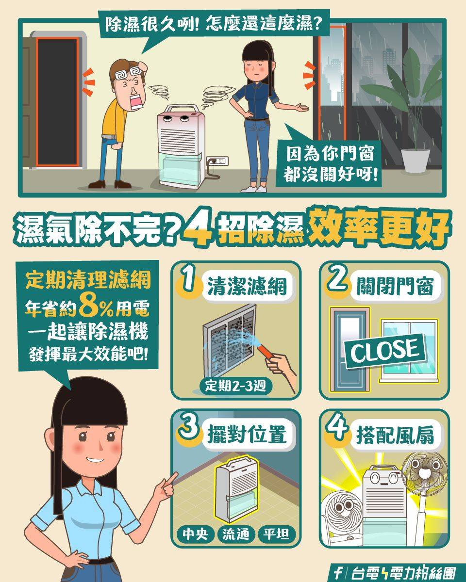 台灣電力公司早前在Facebook專頁「台電電力粉絲團」中發帖分享,指濕冷天氣來襲,部分人在家中長開抽濕機,但總覺得空氣很潮濕,台灣電力公司便教授大家如何更有效率地使用抽濕機,讓抽濕機發揮最大效能,同時節省能源和電費。