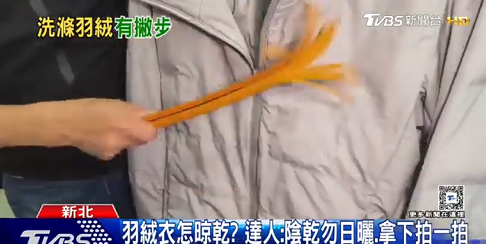 洗完羽絨衣後,不要直接放在陽光下暴曬,因陽光的高溫可能會使羽絨變脆,降低蓬鬆度。正確做法是將羽絨衣掛起,放在通風處陰乾2至3天後,用橡皮水管等棒狀物輕輕拍打,有助恢復羽絨的蓬鬆感,最後再掛起來,陰乾約2、3天即可。