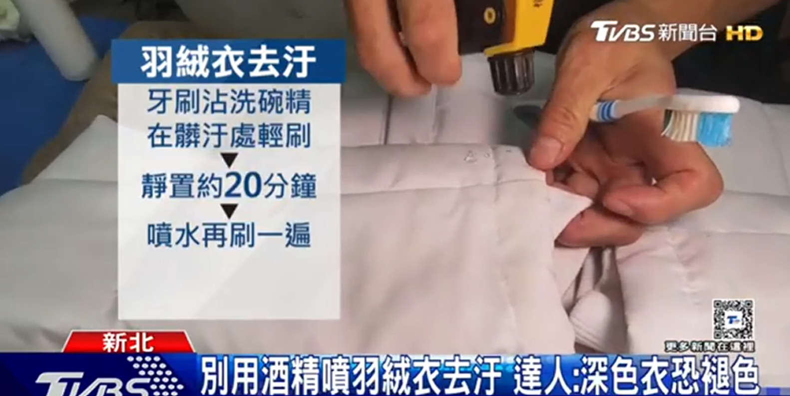 網上流傳用紙巾包住肥皂,再配合酒精,能吸附羽絨上的污漬。然而實測發現這種方法的效果並不明顯,沈富育亦表示,酒精在使用過程中需格外小心,尤其深色衣物,噴灑酒精後可能會導致染料褪色。