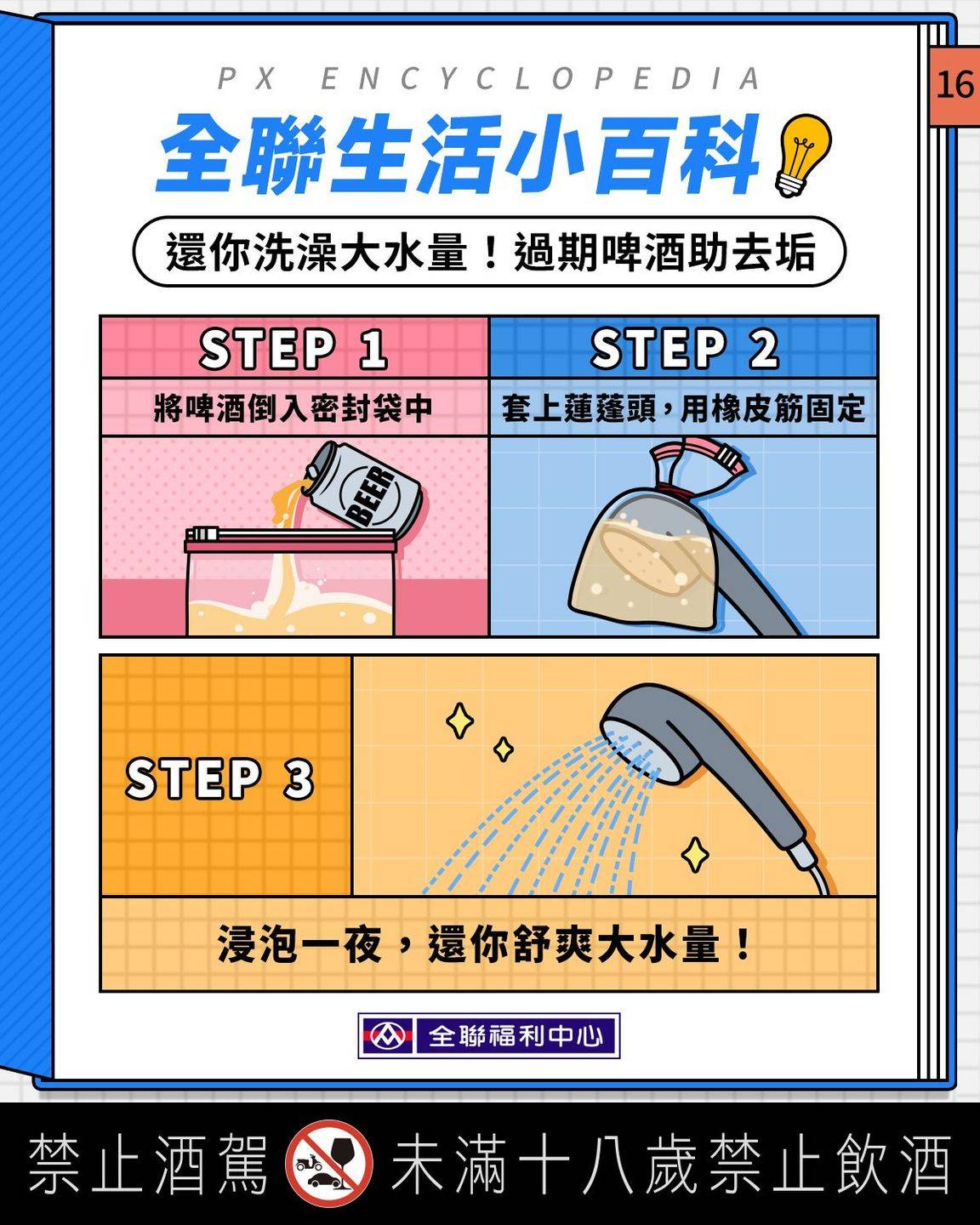 台灣超市「全聯」亦曾在官網的「生活小百科」分享,飲剩或過期的啤酒,與其倒掉浪費,其實可以用來去除花灑頭的污垢,步驟如下: