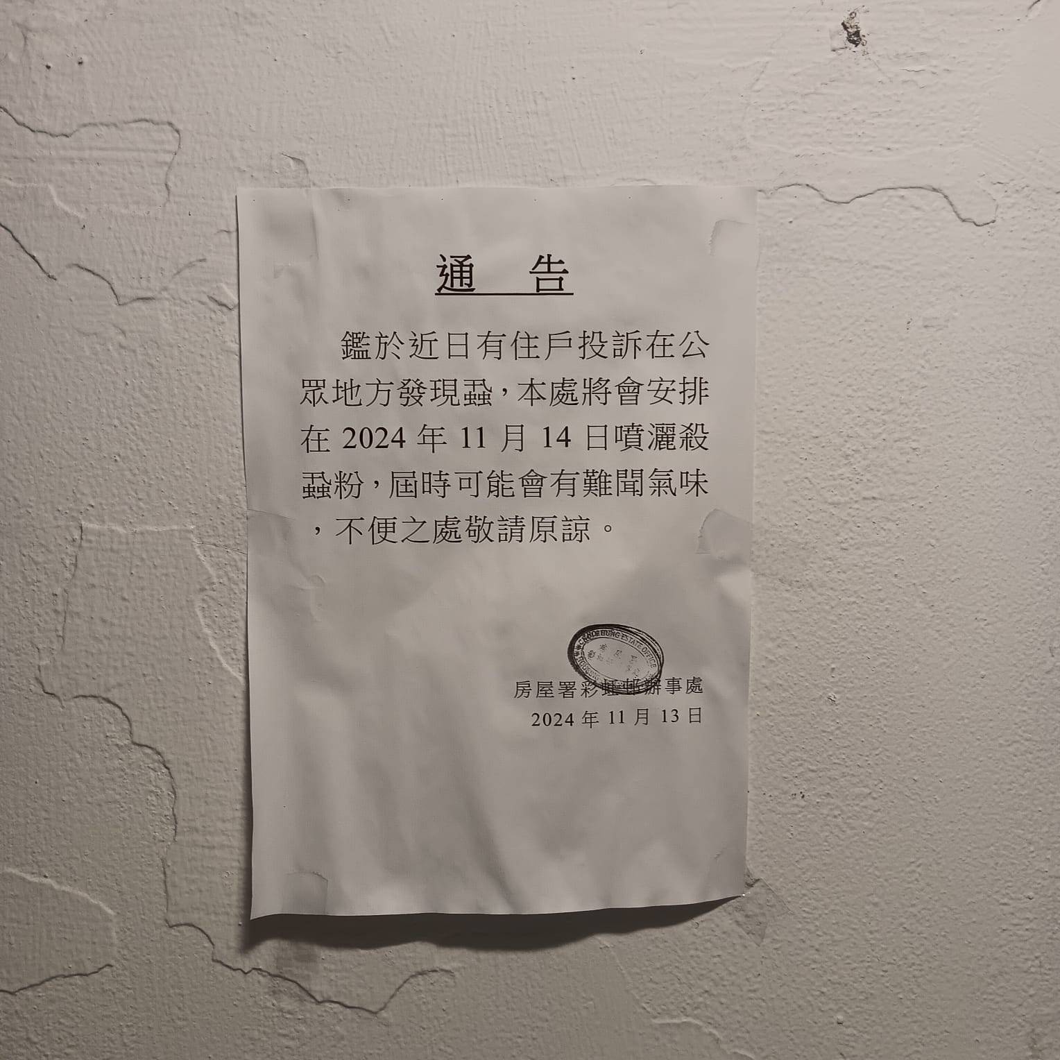 一名女網民早前在Facebook群組「如何殺滅床蝨,木蚤,臭蟲論壇」發帖,她表示自己居住彩虹邨,形容其居住的大廈最近出現嚴重床蝨問題,房屋署雖已派員噴灑殺蟲劑,惟她認為效果並不理想,「我發現床蝨仍然存在,而且數量似乎沒有減少。」
