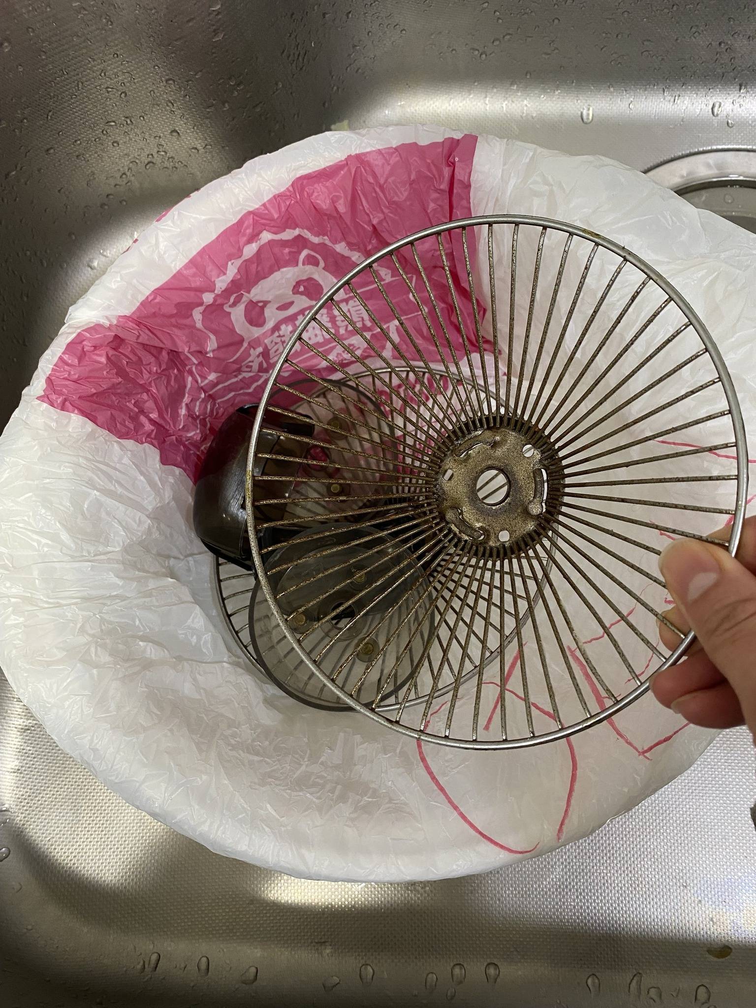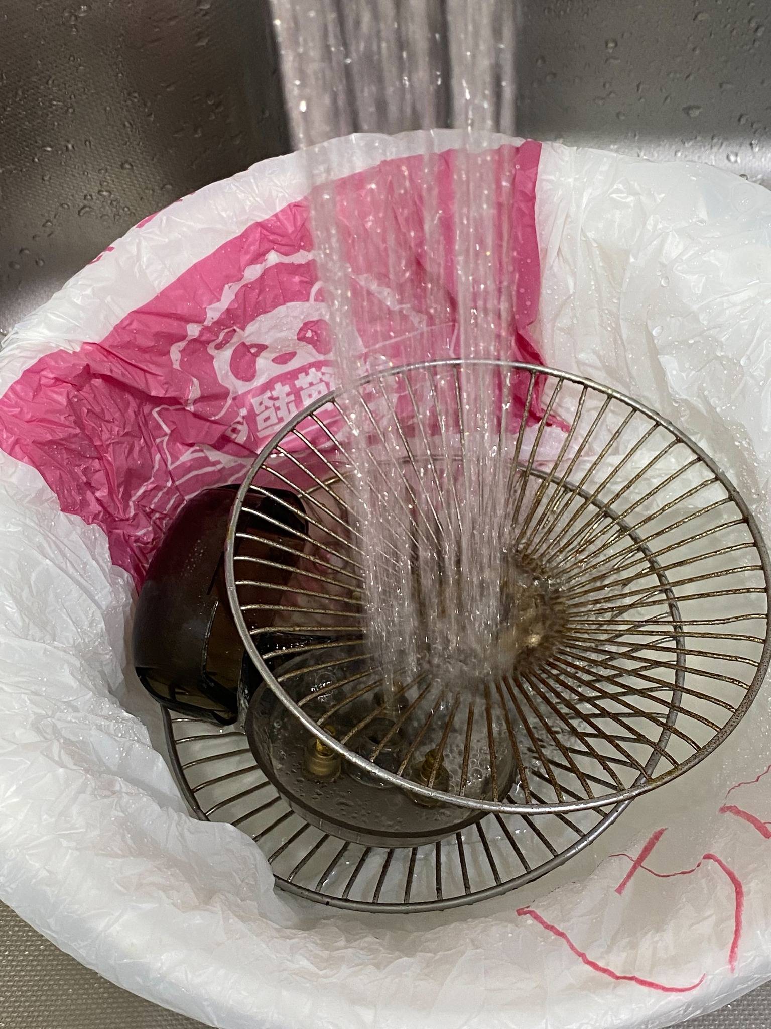 步驟一. 準備一個厚一點的膠袋,把膠袋套在小水盆或任何容器上,再把要清潔的濾網、集油杯等,統統放入袋中。
