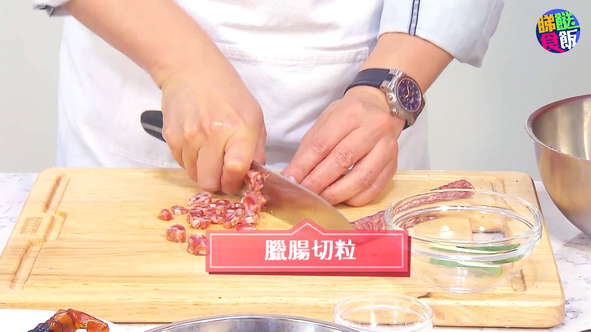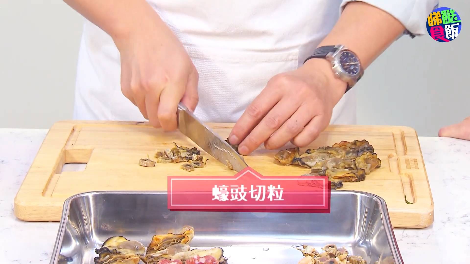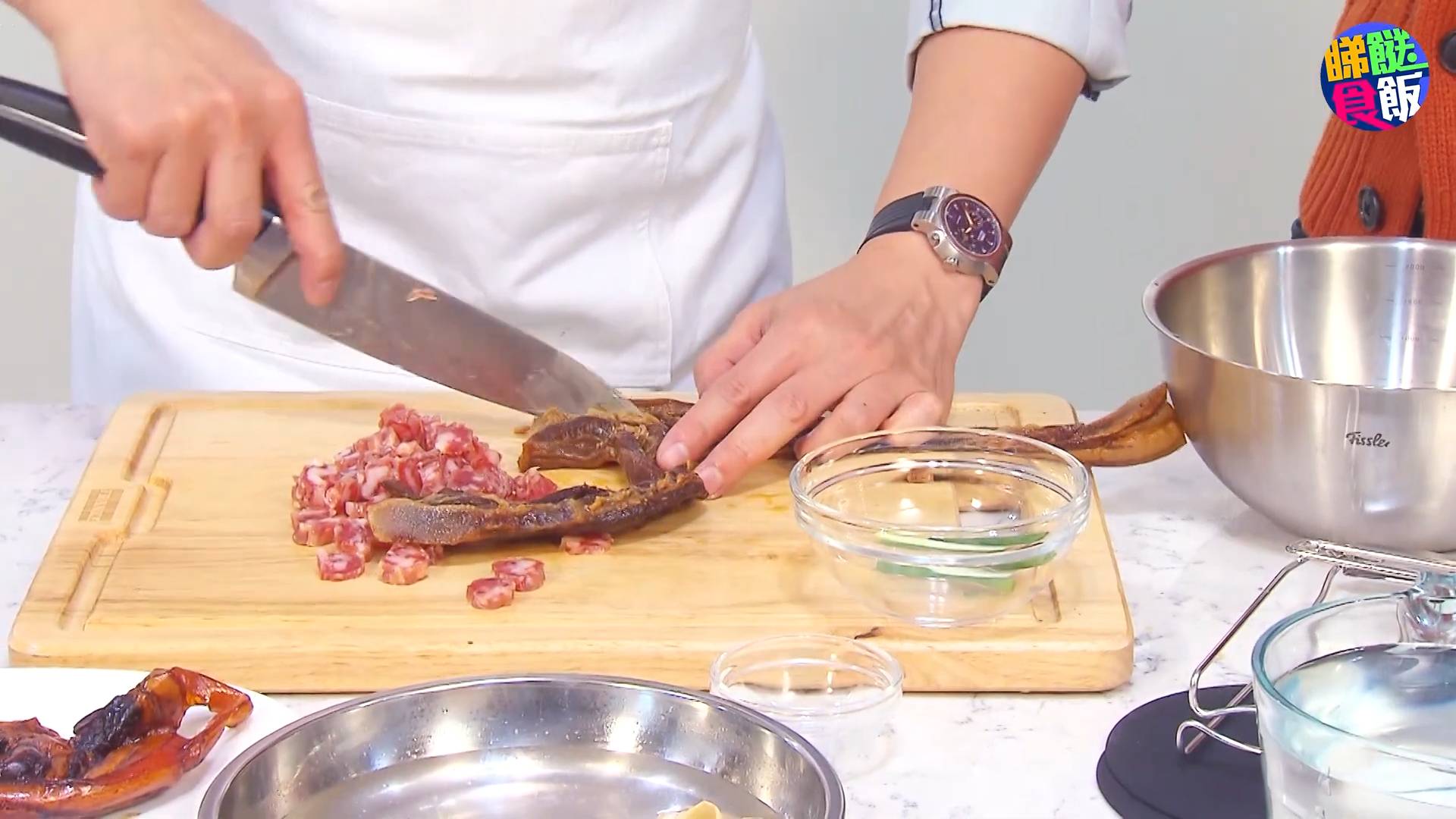 步驟二. 蠔豉洗淨,加薑、蔥、少許熱水蒸15分鐘後切粒。臘肉洗淨加少許水蒸10分鐘後切粒。臘腸洗淨,用水浸約10分鐘,撕去臘腸衣,切粒。花生洗淨,用清水浸約1小時,備用。