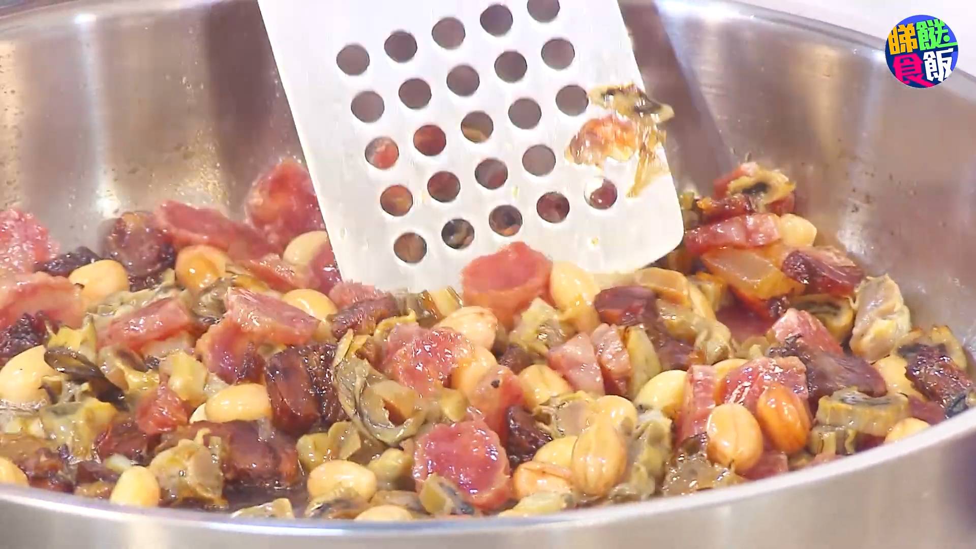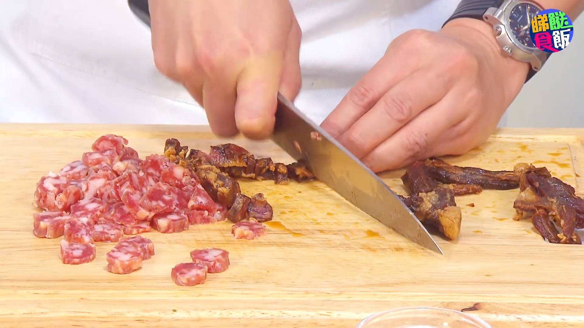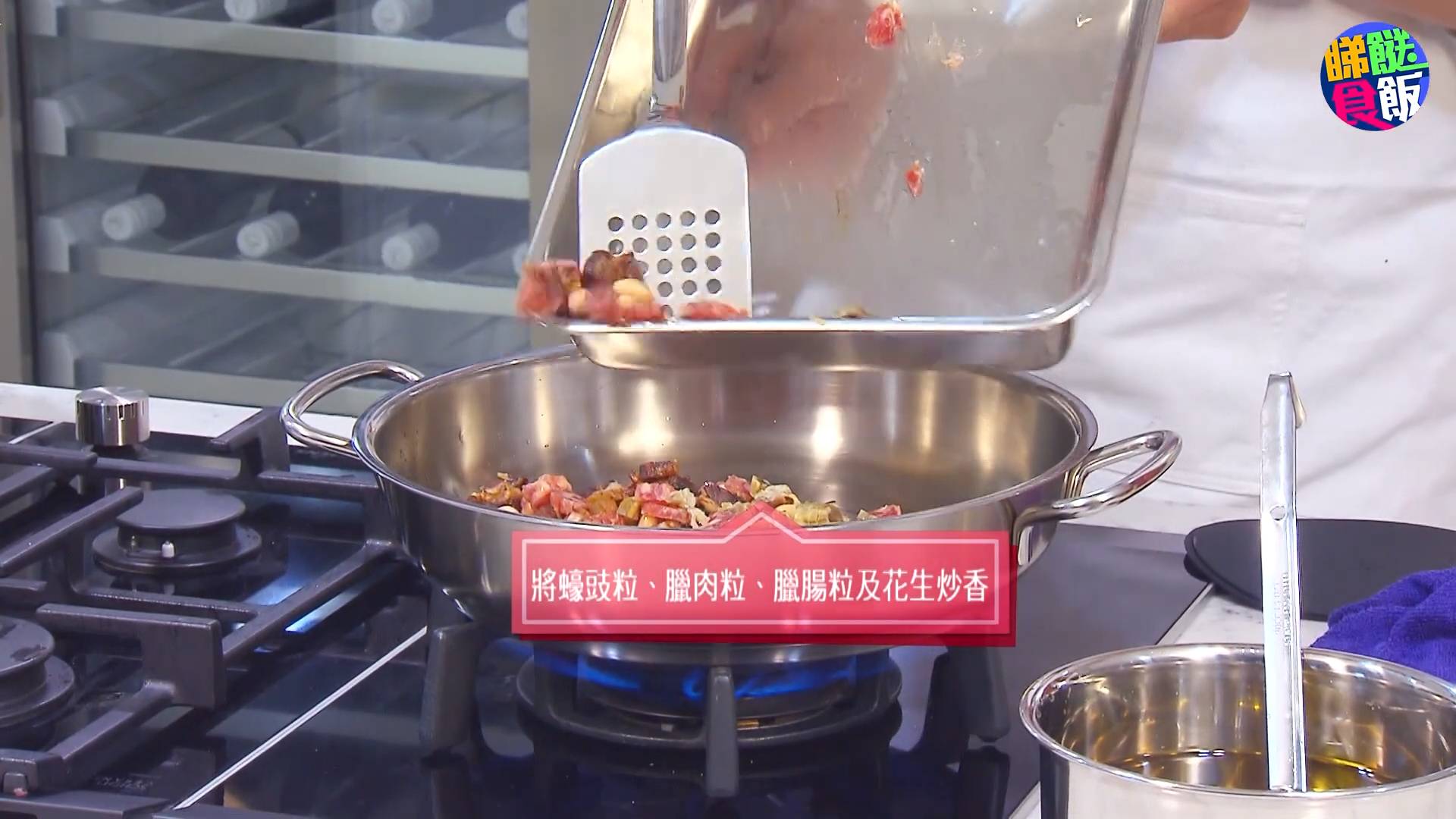 步驟五. 鑊中燒熱少許油,將蠔豉粒、臘肉粒、臘腸粒和花生炒香,備用。