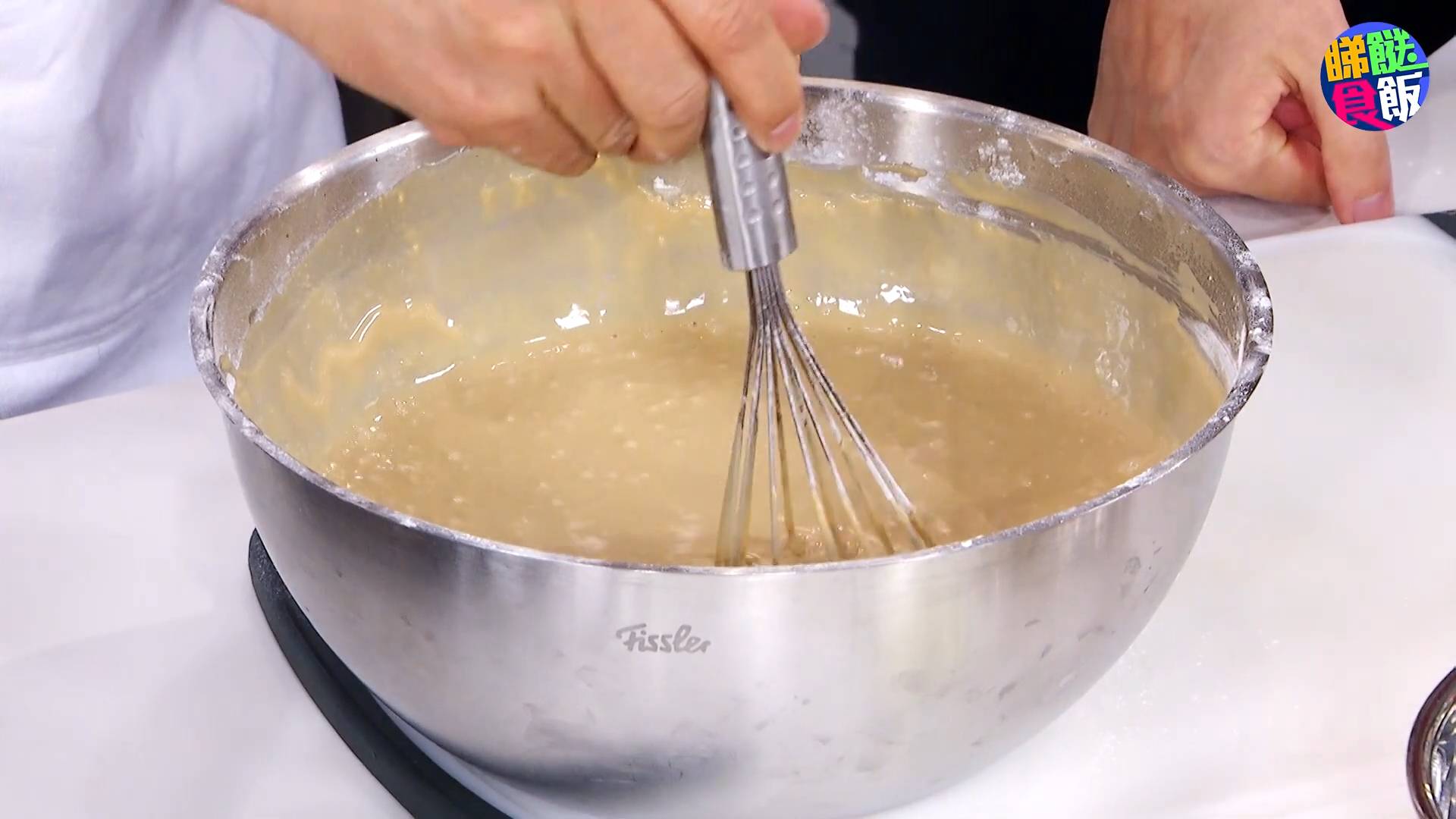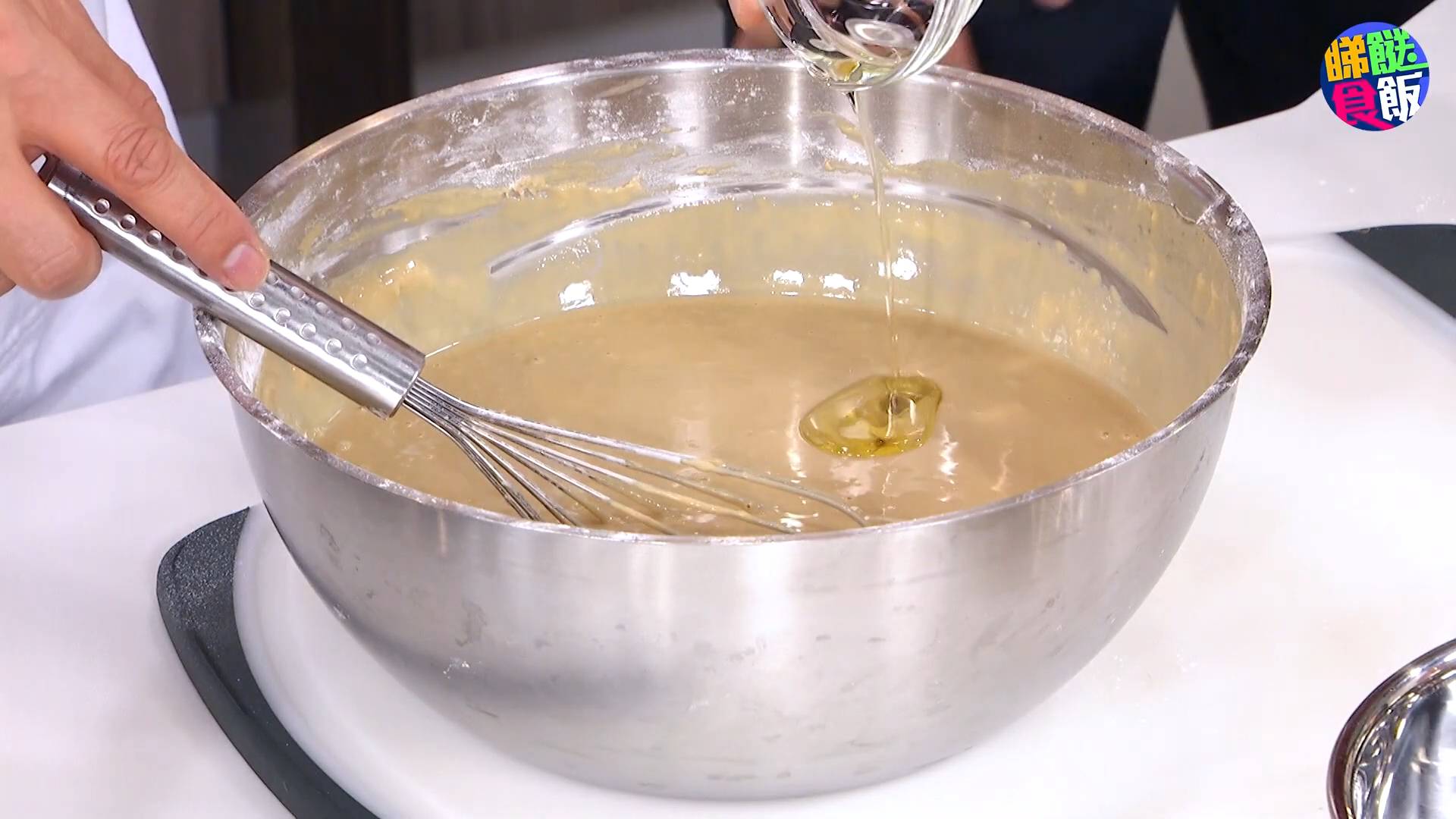 步驟三. 加入油,繼續攪拌至粉漿完全融合,再用密篩過濾雜質。