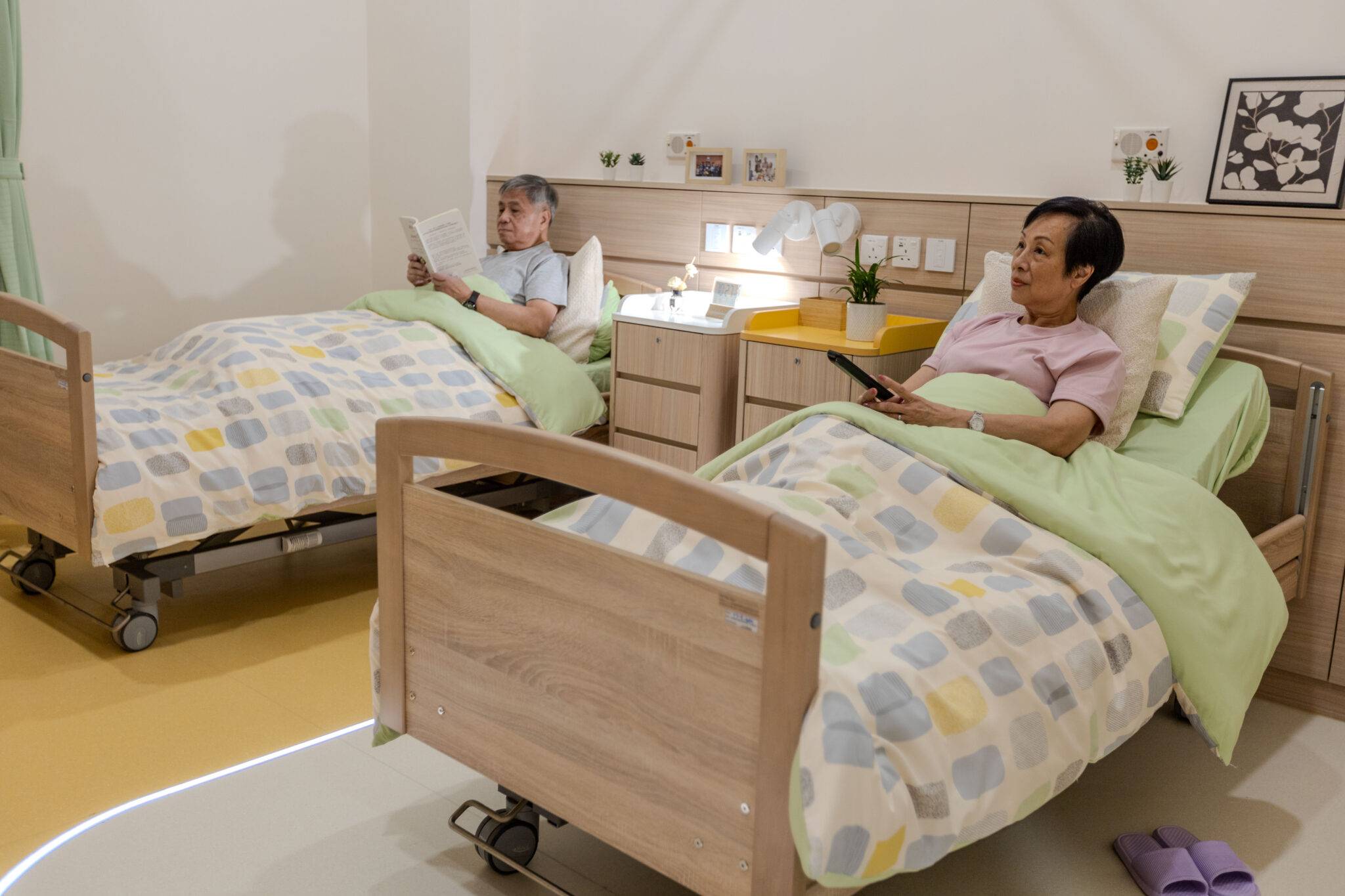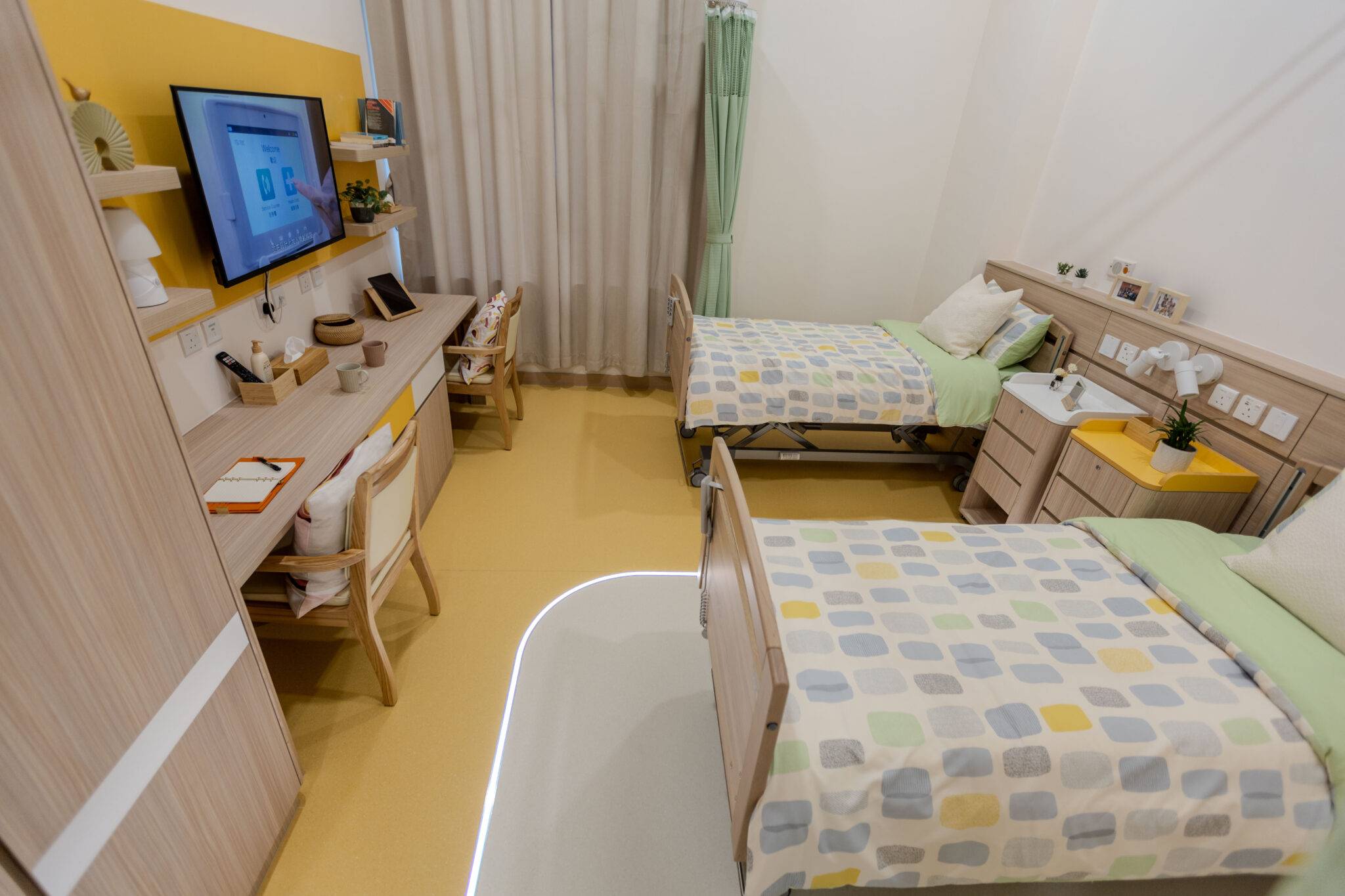 📌 普通房間|醫療床(獨立燈光調控系統)、獨立洗手間( 洗手間/沐浴間設有跌倒安全偵測)、電視機、感應夜燈、獨立衣櫃、儲物櫃及書枱、輕觸式屏幕電腦