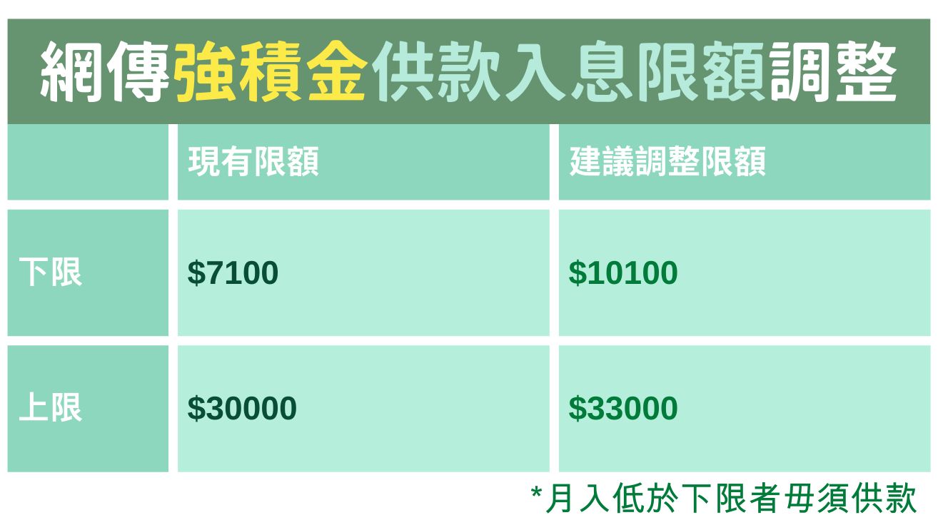 近日流傳消息,指積金局有意調整強積金(MPF)供款入息限額,由現有的下限$7100港元,提升至$1.01萬港元,而供款入息上限則倡由現行的$3萬港元升調高至$3.3萬港元,規定的MPF供款5%則未有消息表示有改動。據講積金局已將建議交予勞工顧問委員會進行諮詢。