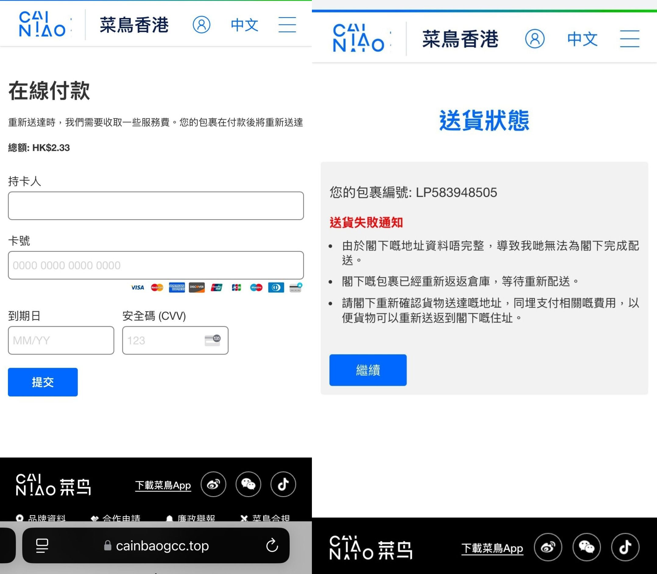 3️⃣ 網民按短訊裏的連結,發現版面與「菜鳥」官網的一模一樣