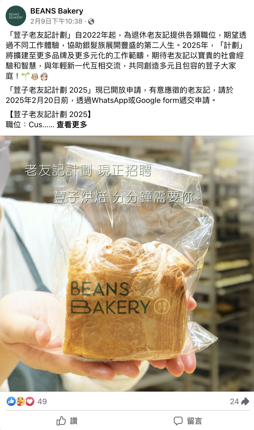 荳子冰室BEANS於自2022年起推出「荳子老友記計劃」,希望幫助銀髮族展開豐盛的第二人生,提供彈性的工作機會,計劃推出以來一共有24名長者在不同崗位工作。前日,餐廳在社交平台出文表示擴大計劃規模,為旗下品牌荳子烘焙BEANS BAKERY 招聘新員工。