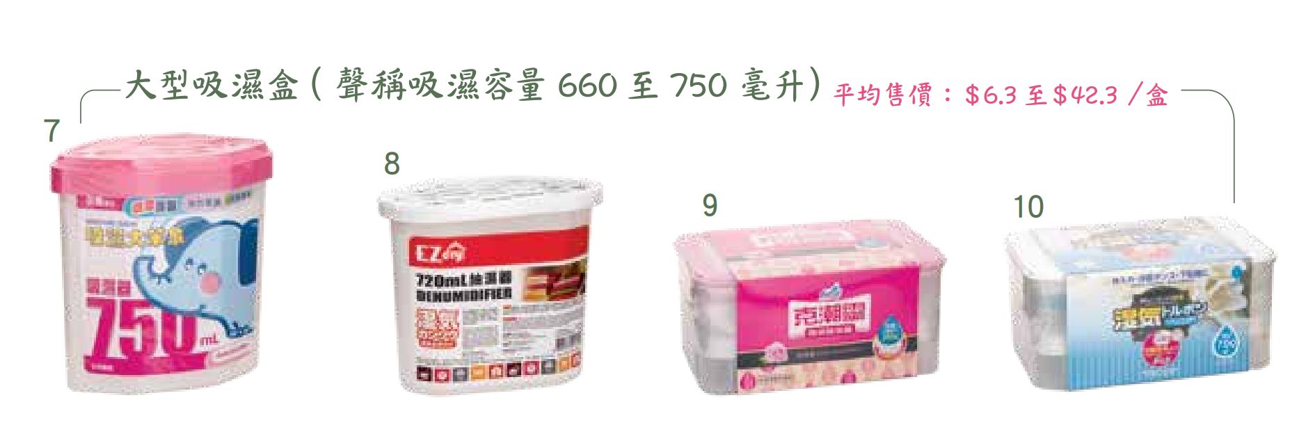 10款盒裝樣本的80天累積吸濕量由227.4至424.9毫升。小型吸濕盒樣本中以「白元」強力抽濕器500mL及「Topvalu」的吸濕量最高,分別有305毫升及300.7毫升;大型吸濕盒樣本則以「克潮靈」及「小久保」吸濕寶盒的吸濕量最高,分別有424.9毫升及406.4毫升。