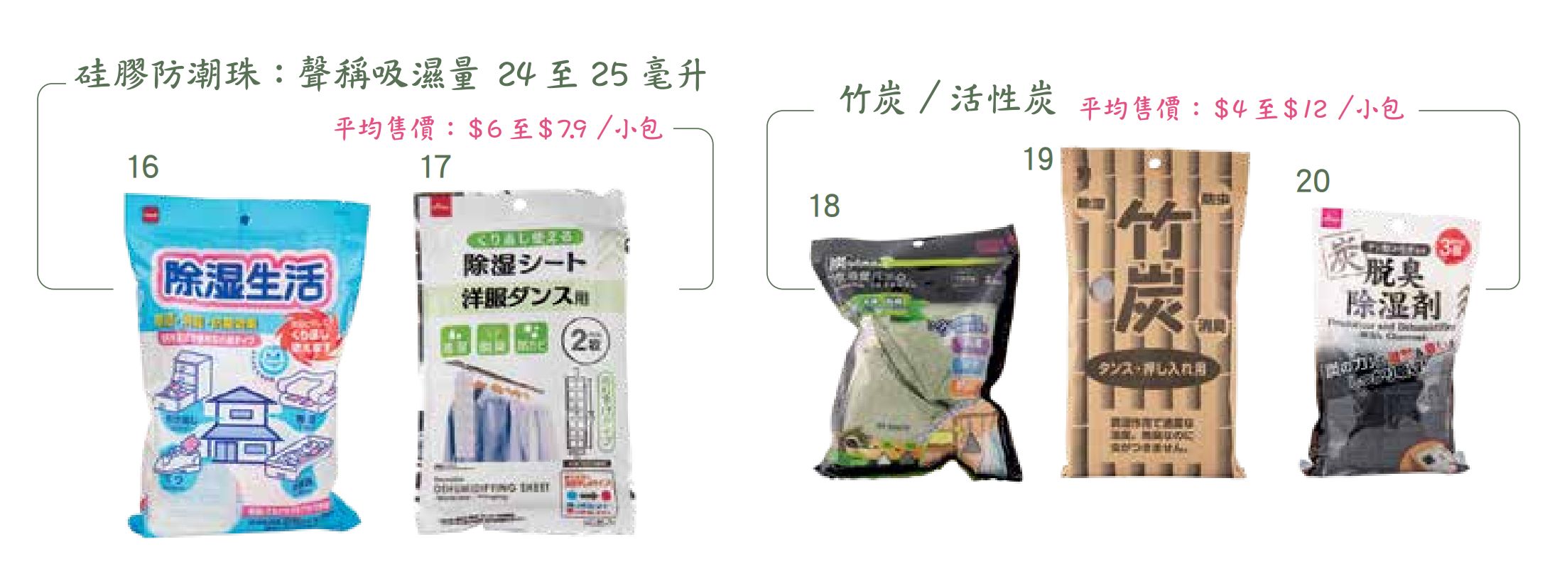 「Goodmarks」、「白元」強力驅塵蟎抽濕袋及「雞仔牌」備長炭消臭抽濕包回滲程度較高,量得的重量差異為19.9%至23.2%,估計是由於吸濕測試後,樣本的累積吸濕量已超過其設計負荷量所致。