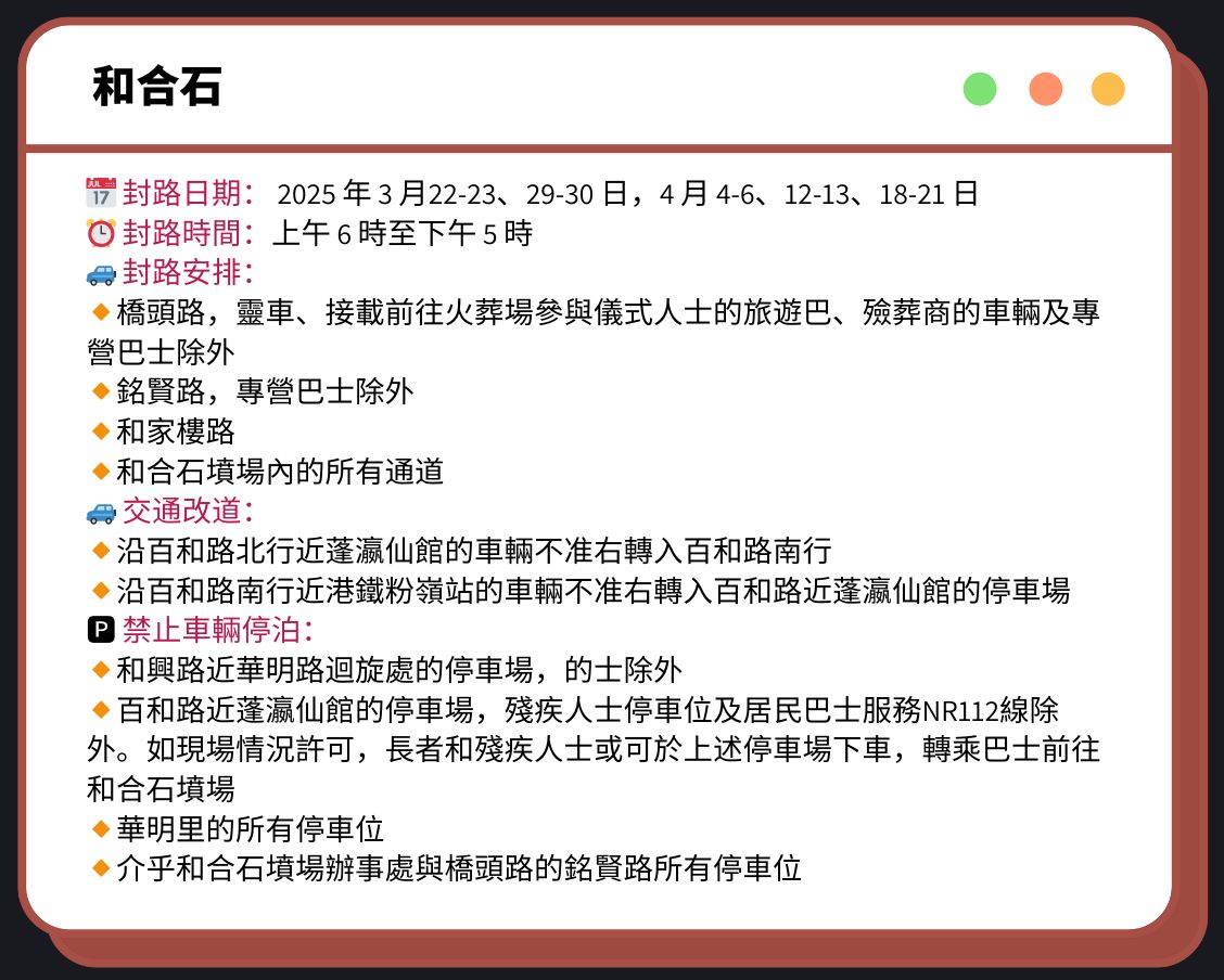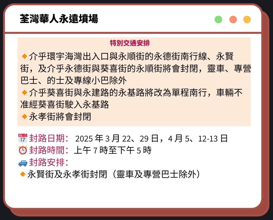 🔗清明節封路2025|柴灣華人永遠墳場/將軍澳華人永遠墳場/長沙灣天主教墳場 封路日期/交通及泊車安排
