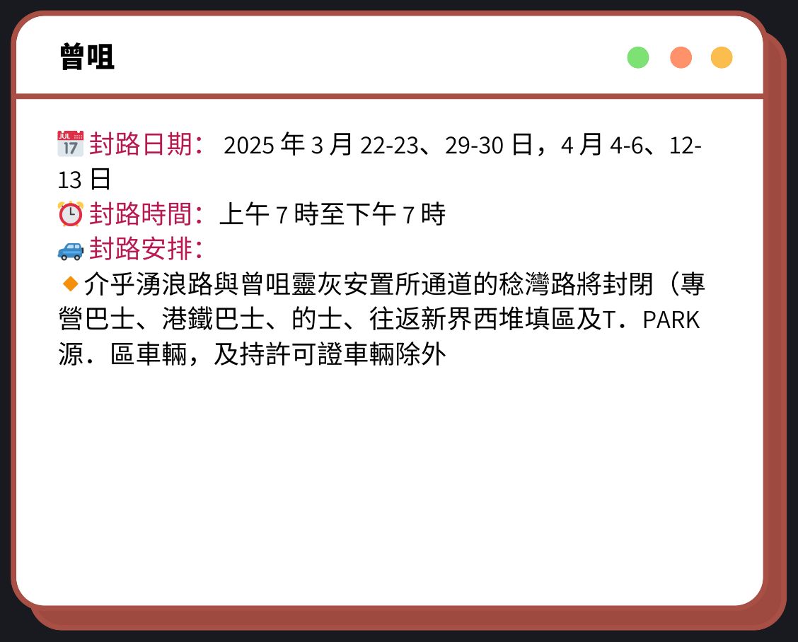 ⏰ 封路時間:上午 7 時至下午 5 時