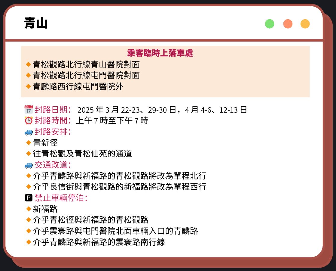 📅 封路日期:2025 年 3 月 22、29 日,4 月 5、12-13 日