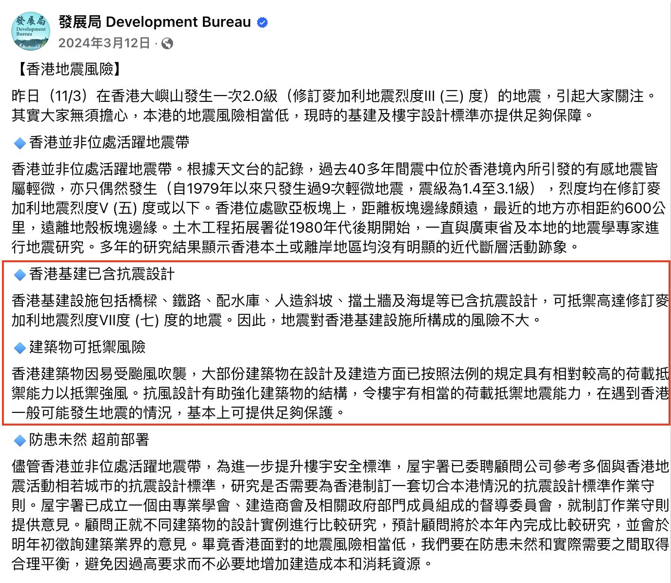 加上,這兩天中大地震專家又指香港以南存在濱海斷裂層,雖然機會很微但仍存在發生7級強震風險,若果香港發生地震,我們所住的樓宇能否頂得住?發展局2024年3月12日在Facebook就3月11日發生香港大嶼山發生一次2.0級地震後講解香港樓宇設計在抗震上的規定。