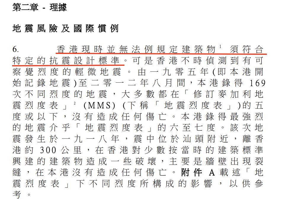 ⚠️ 據2012年立法會秘書處文件顯示,現時的《建築物條例》並沒有規定本港私人樓宇需要具備抵禦地震的設計。