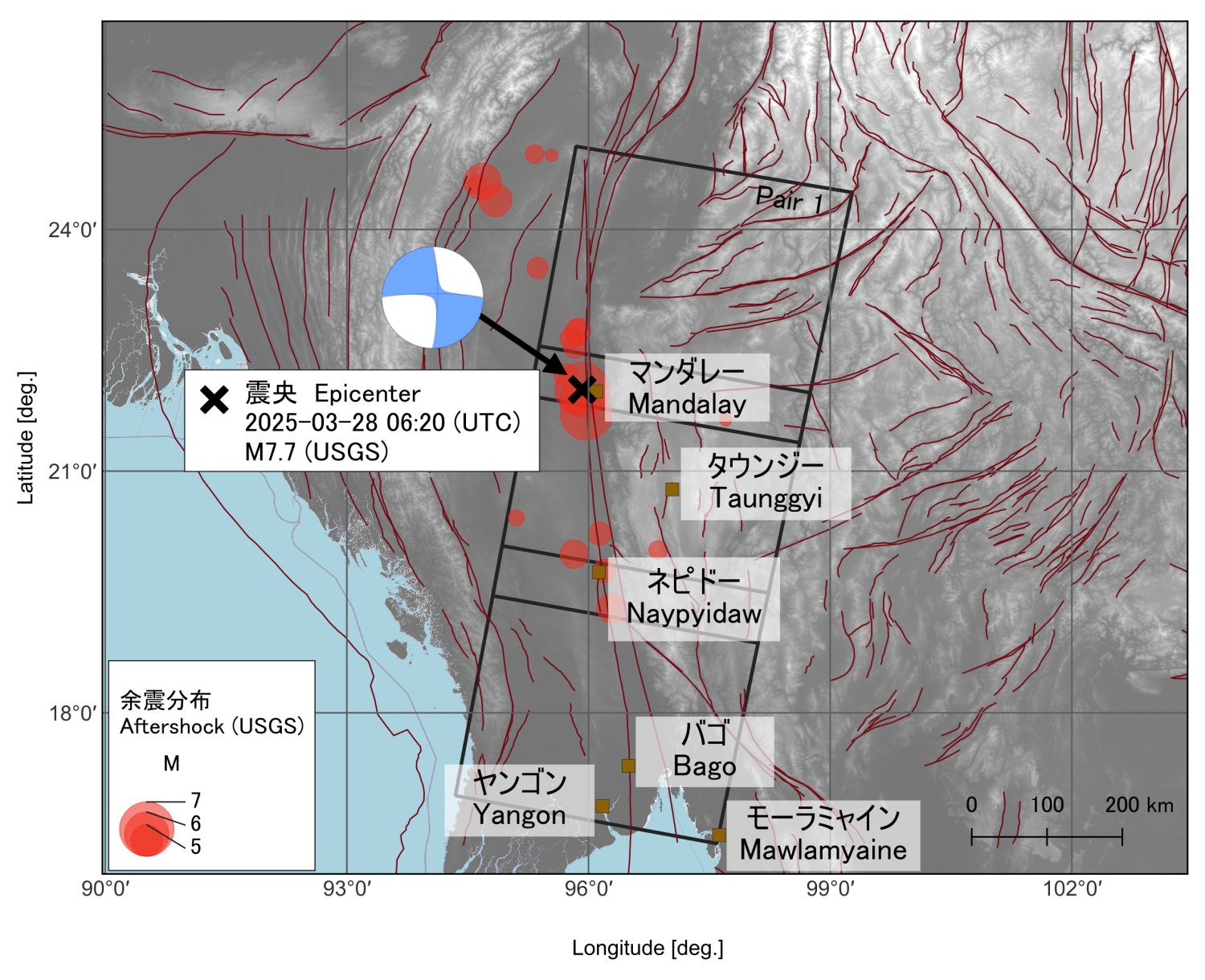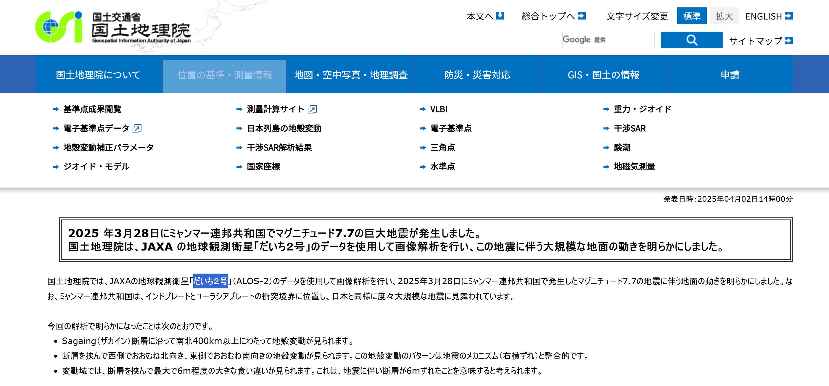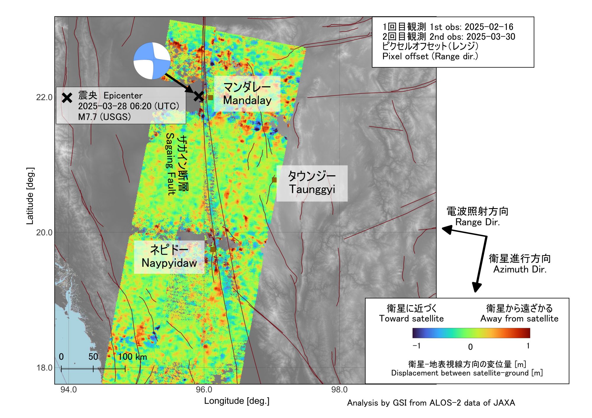 日本國土交通省國土地理院利用 JAXA 地球觀測衛星「だいち2号」(ALOS-2)的資料進行影像分析,確認了2025年3月28日緬甸發生M7.7級地震所帶來的地表運動,位於印度板塊與歐亞板塊的碰撞邊界上的緬甸出現以下3種情況。