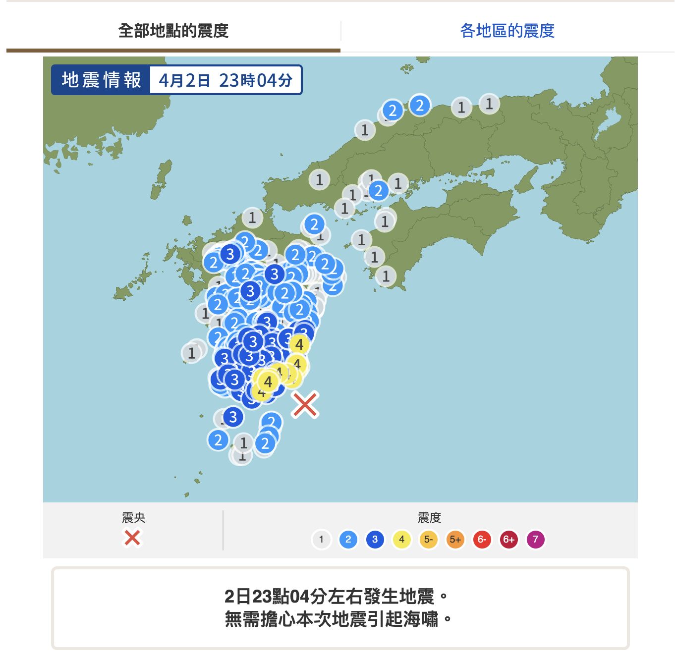震度:宮崎縣部分地區震度為5弱,鹿兒島縣部分地區震度為 4級。
