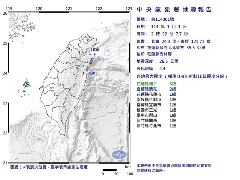 震央位置:花蓮縣政府北方19.1公里。