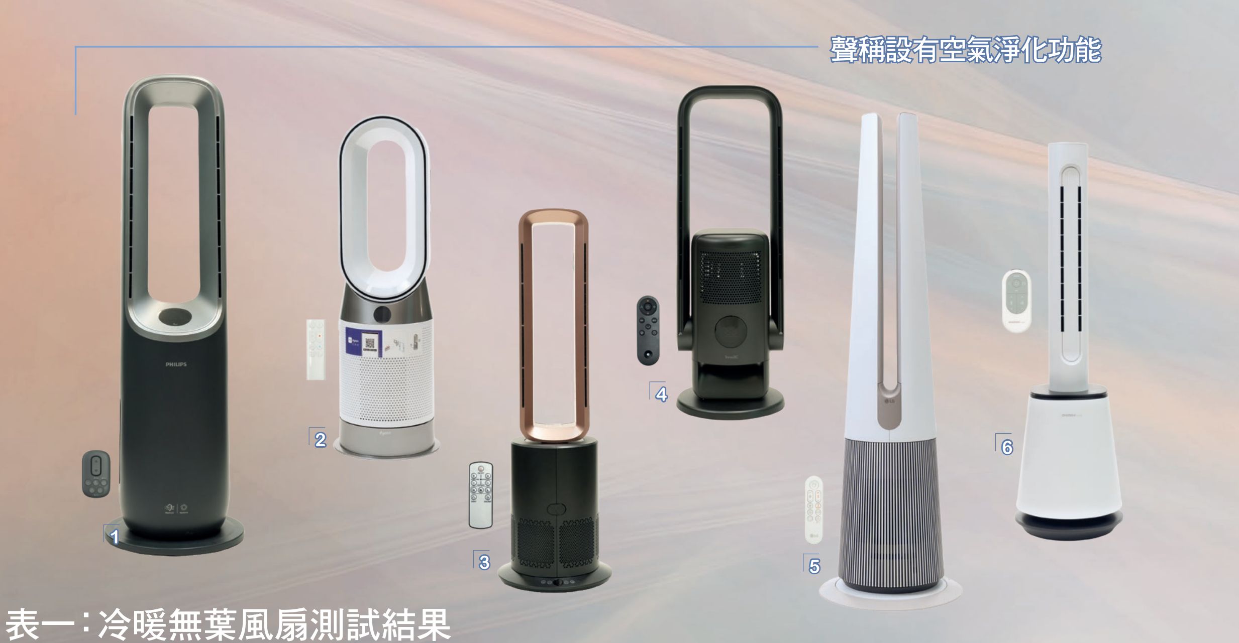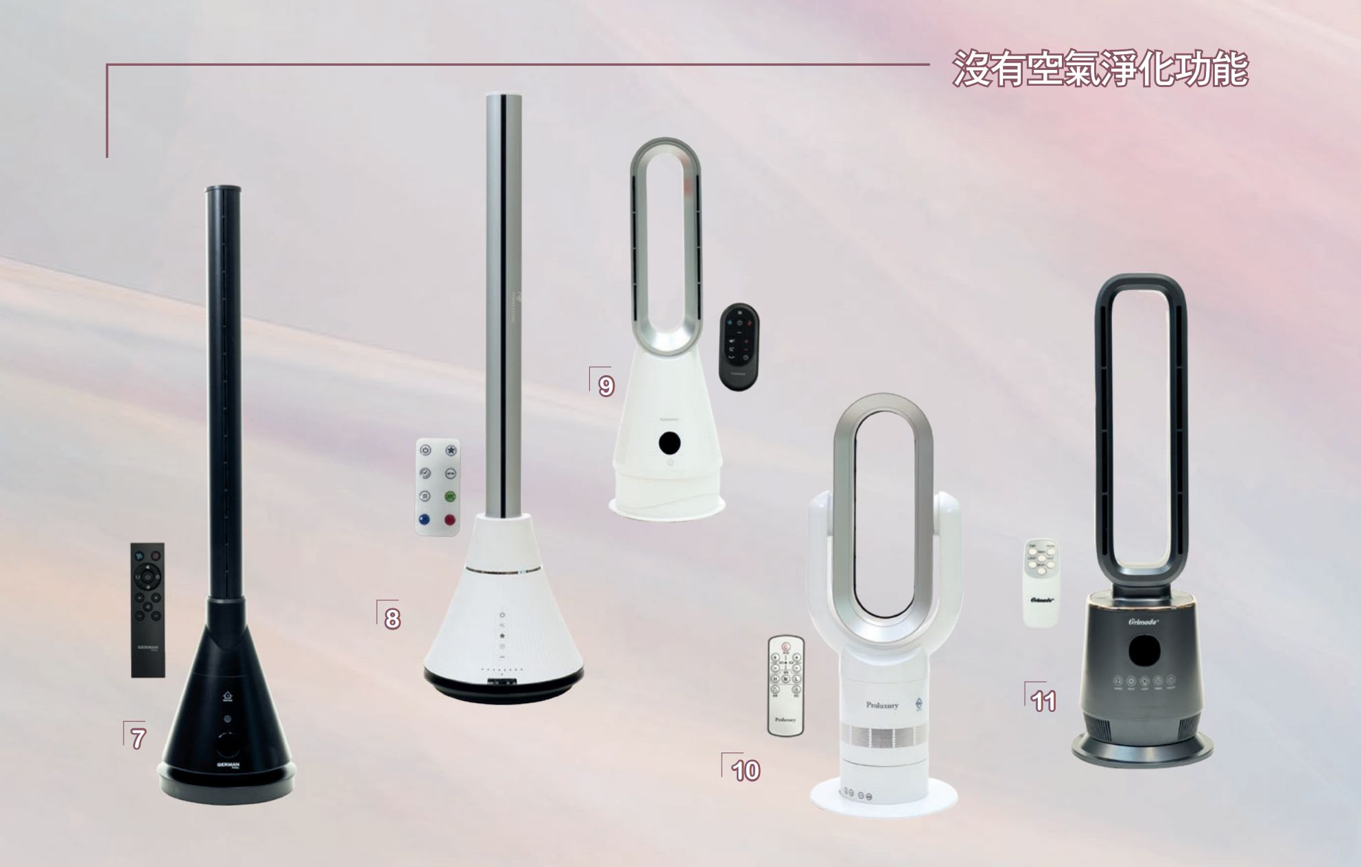 是次測試11款備有暖風及涼風功能的無葉風扇,售價由$699至$6,988,各樣本暖風功能的額定功率由1,300瓦特至2,200瓦特,而涼風功能的額定功率則由23瓦特至40瓦特。是次測試中,6款樣本隨機附送HEPA(High Efficiency Particulate Air)過濾器,聲稱可同時淨化空氣。