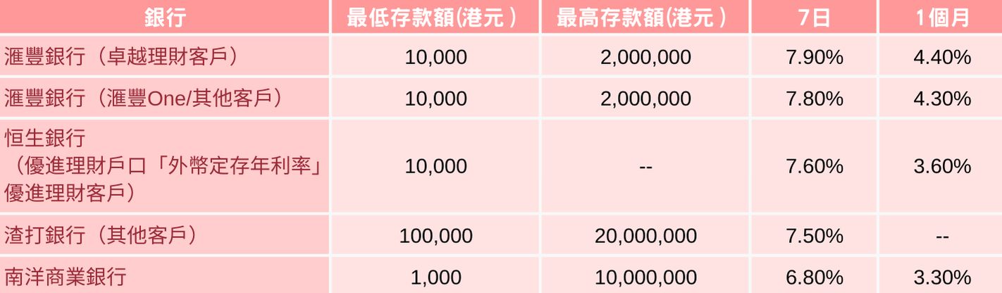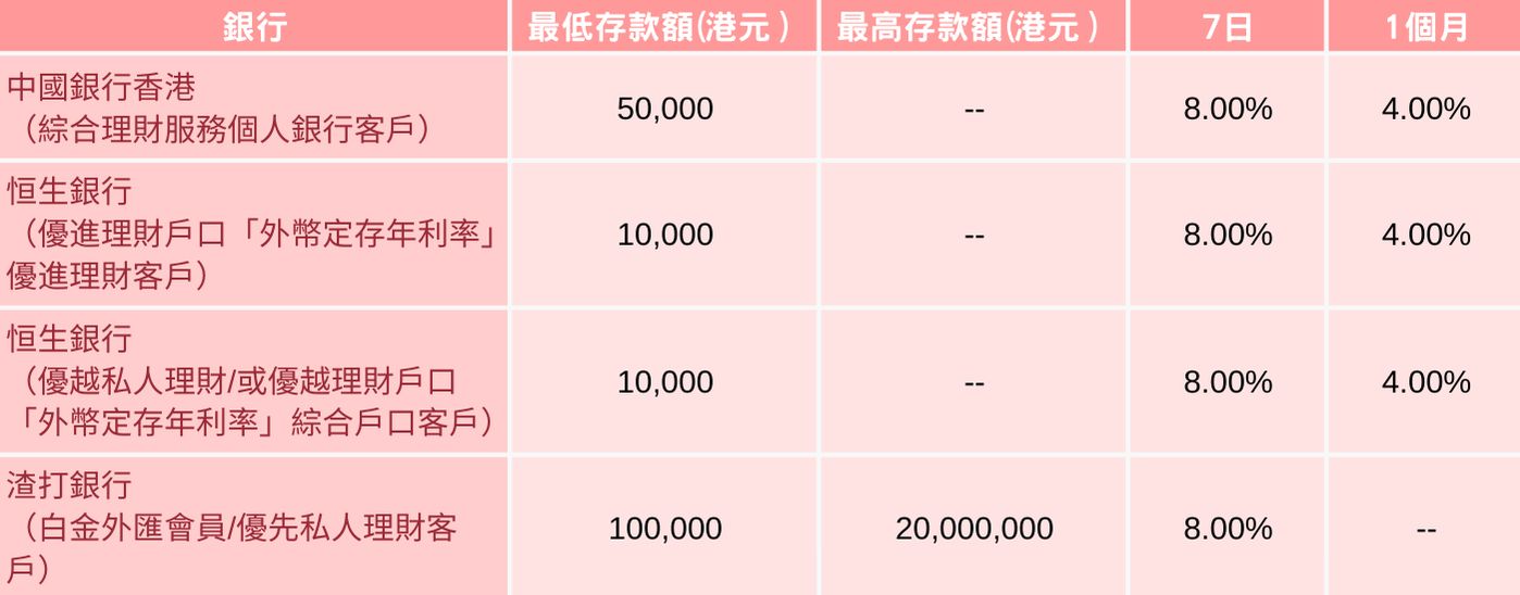 🏦 特別條件|「倍高息定期存款」:客戶透過網上銀行或手機Apps以兌換資金存入等值港幣1000元/分行存入等值港幣3萬元