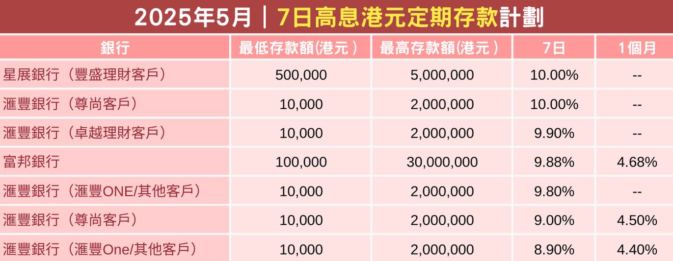 【港元定期存款/港元定存/理財/高息計劃】美國加關稅、股票市場亦見波動,定期存款成了通貨膨脹及經濟不穩下的生息工具,不少銀行都推不少高息港元存款近期來吸客,各銀行為了吸客,5月提供多個高息港元定期存款計劃,當中4間銀行更提供10厘高息,當中以滙豐最進取,小本資金1萬元都可以有10厘息,即睇攞高息的條件!文中亦有16個高息港元定期存款戶口推薦。