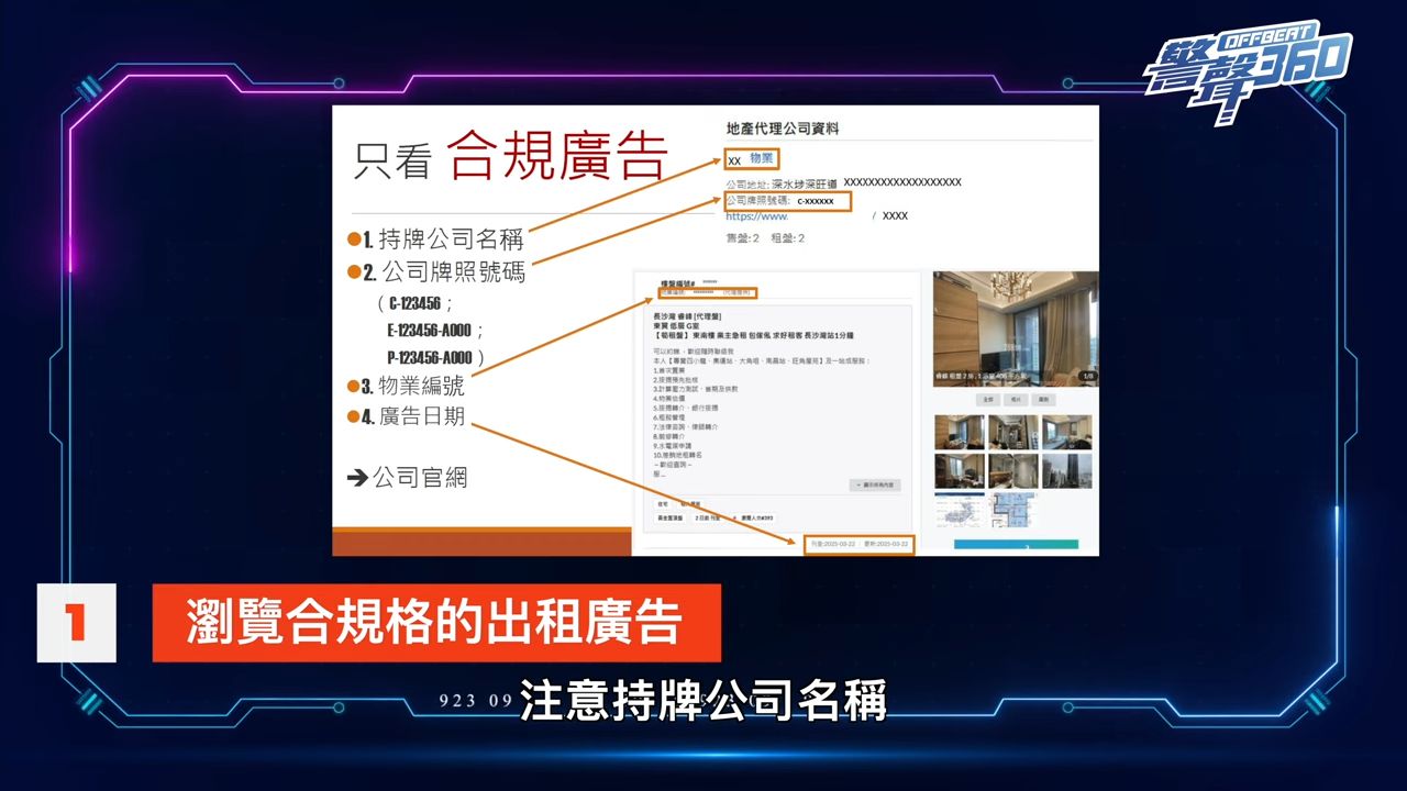 1️⃣ 選擇正規平台瀏覽租房廣告,仔細查看持牌中介公司名稱、牌照號碼、物業編號及公司官方網站等信息