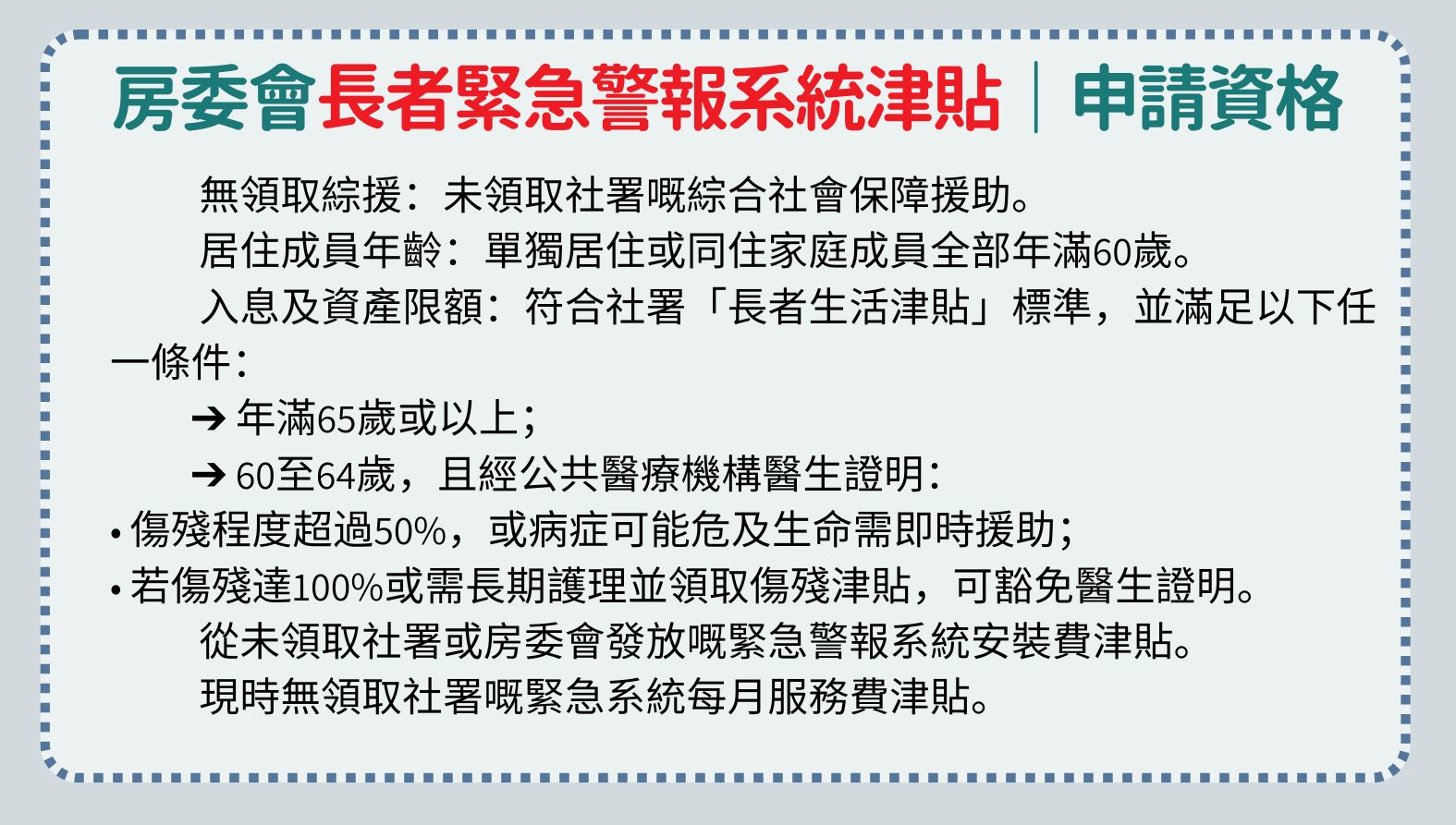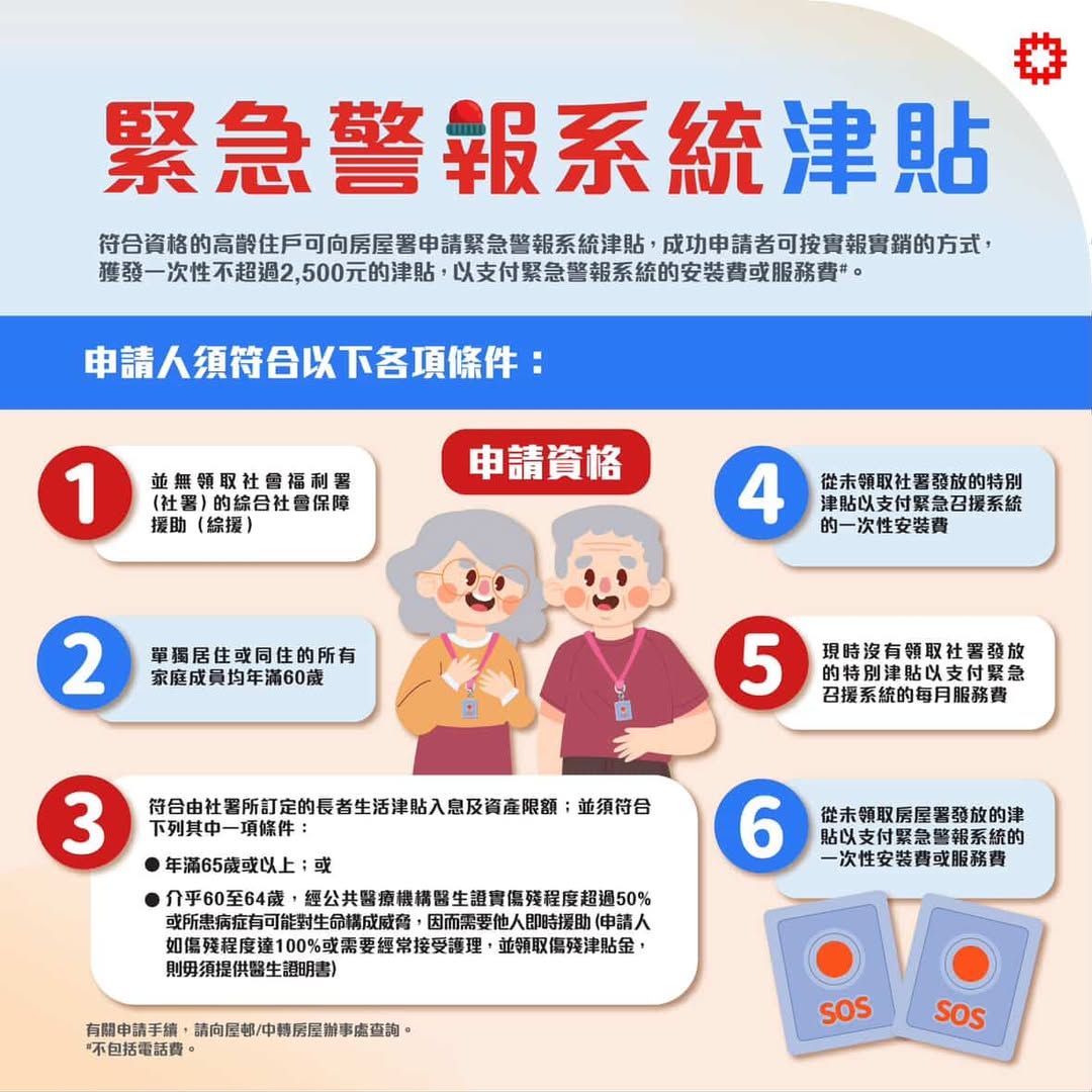 【公屋/公屋長者/長者福利/長者健康/長者生活/家居安全/政府津貼/房委會緊急警報系統津貼/平安鐘】根據房委會房屋統計數字,截至2024年3月底,全港約有19.8萬長者戶(即所有住戶成員皆為60歲或以上)居住於房委會公屋單位,佔公屋住戶總數約25%,房委會亦有不少便利長者公屋住戶的措施,好像「緊急警報系統津貼」(俗稱平安鐘),房委會一次給予不多於$2500資助長者住戶購買具警報功能的智能產品。一旦遇上緊急情況,長者即可求助。