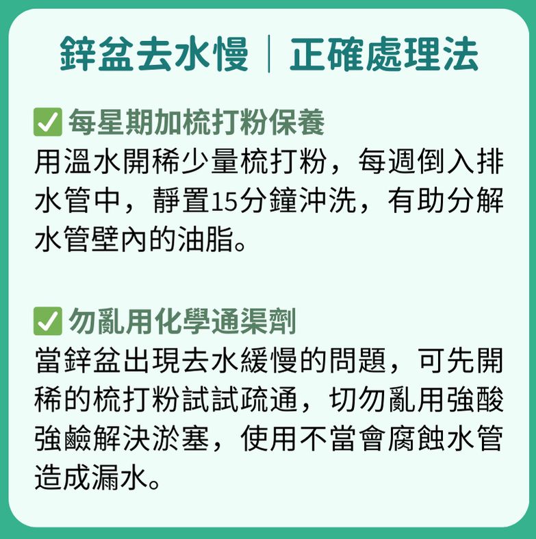 當鋅盆出現去水緩慢的問題,可先開稀的梳打粉試試疏通,切勿亂用強酸強鹼解決淤塞,使用不當會腐蝕水管造成漏水。