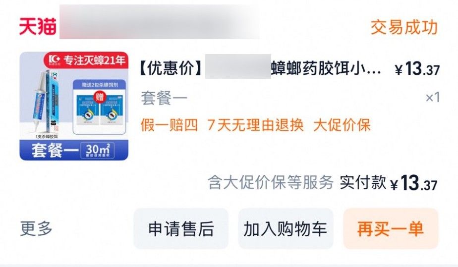 因此,事主從內地網購平台「淘寶」購買一款「殺蟑膠餌」,價錢只需13.37人民幣(約15港元),形容「上年用咗3分1,噚日又用咗啲,今日大大小小執咗4、5隻,應該可以用埋出年,買呢啲得㗎啦」。