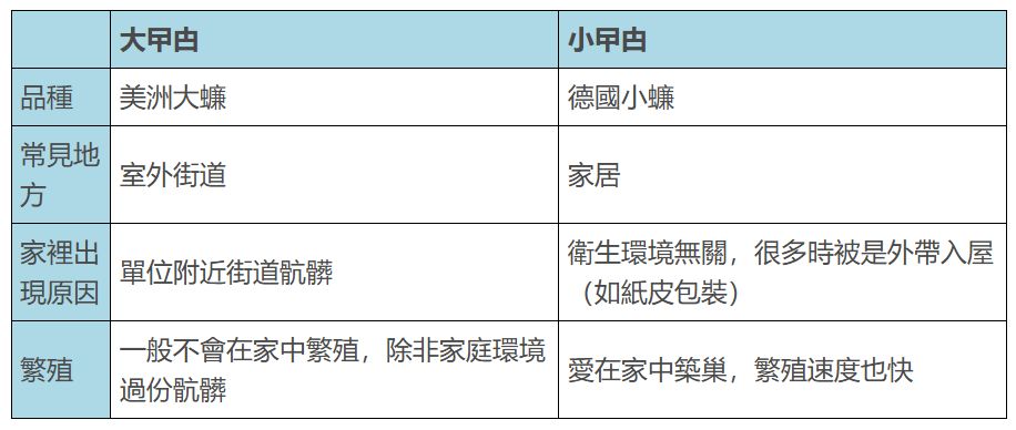除非家庭環境骯髒,否則美洲大蠊不會在家中大量繁殖。德國小蠊與衛生環境無關,很多時是外帶入屋,牠們愛在家中築巢,繁殖速度也很快。要滅絕牠們,必須用低藥性、帶傳染性的藥餌,讓牠們帶到巢中,把牠們一網打盡。
