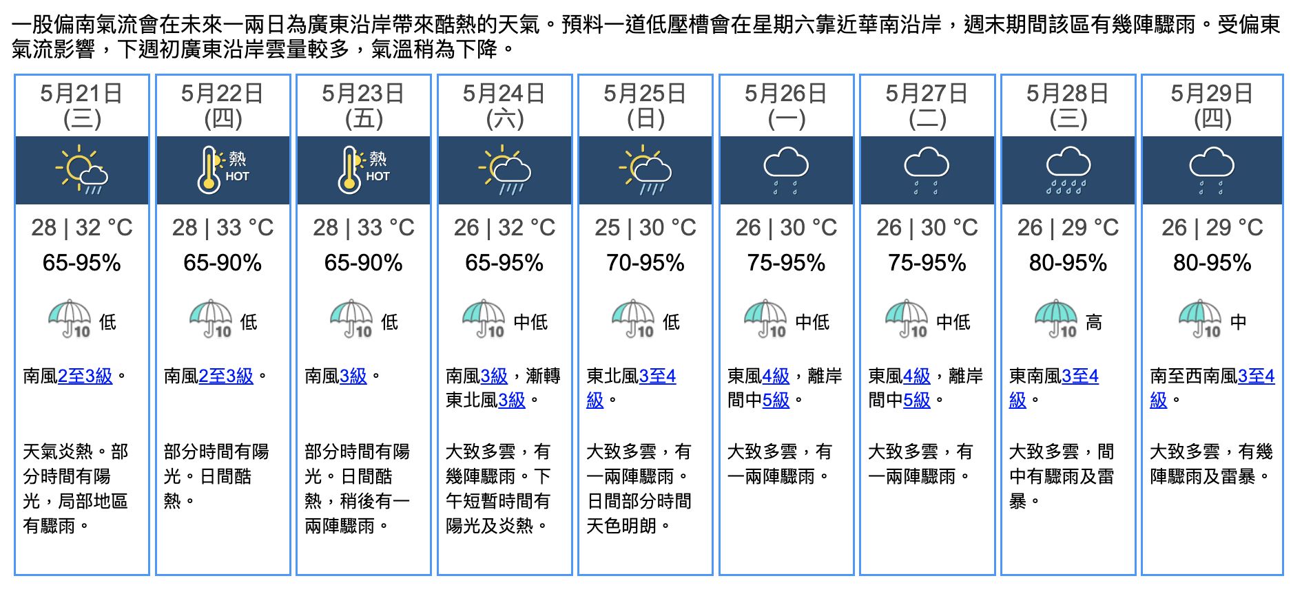 香港天文台9日天氣預報表示:一股偏南氣流會在未來一兩日為廣東沿岸帶來酷熱的天氣。預料一道低壓槽會在星期六靠近華南沿岸,週末期間該區有幾陣驟雨。受偏東氣流影響,下週初廣東沿岸雲量較多,氣溫稍為下降。下周四(5月26日)下雨。