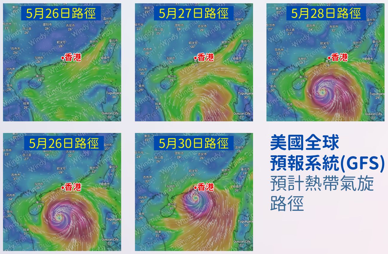 根據美國全球預報系統(GFS)預測,下周一(5月26日)南海可能會生成一個熱帶氣旋,之後向北移動,逐步接近廣東沿岸。下周四(5月29日)該氣旋可能會在沙堤附近「直角轉彎」轉向東北,到5月30日(下周五)時最接近香港,並可能在汕尾一帶登陸,根據GFS表示,今次的熱帶氣旋結構龐大,但天文台及其他氣象機構則未有進一步颱風級別的預測。