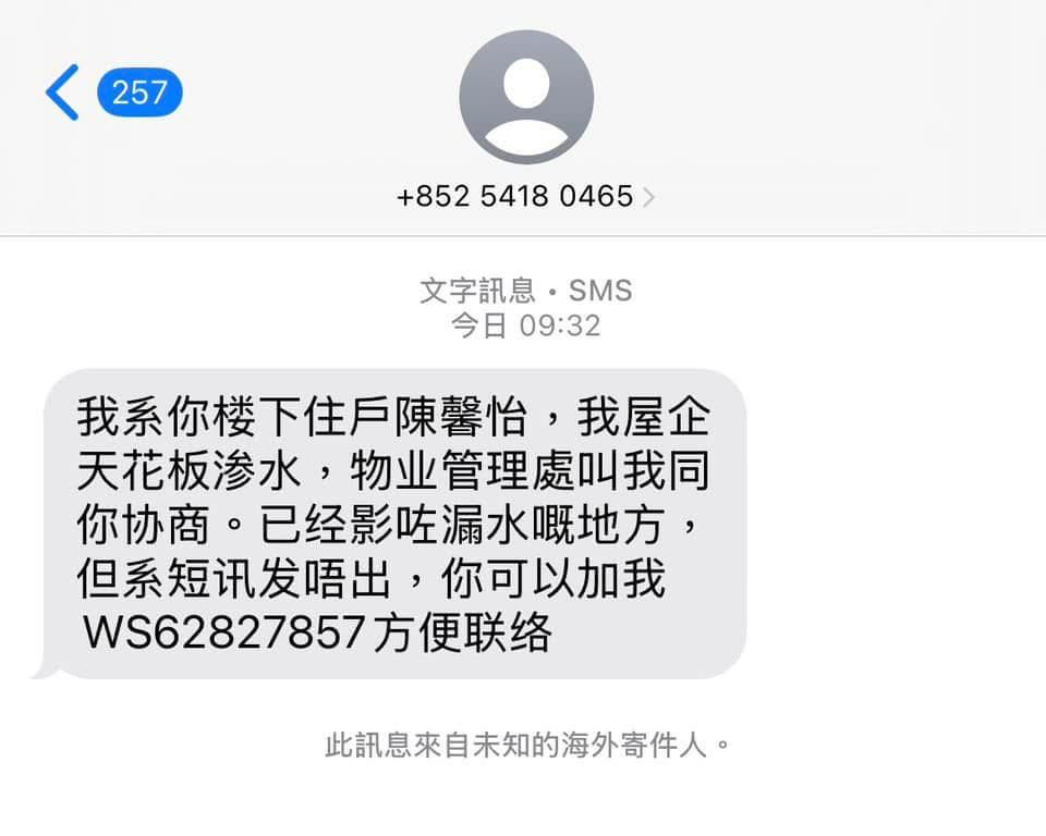 2️⃣ 騙徒以住所漏水、噪音問題為由,試圖與你聯繫。