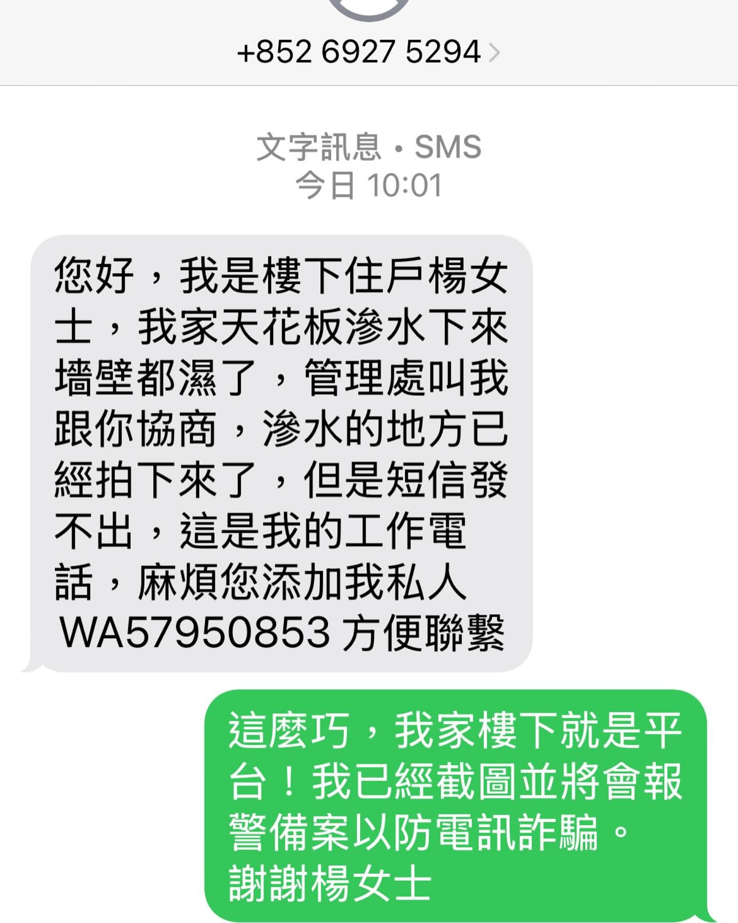 1️⃣ 冒充鄰居以「漏水問題」或嘈音為由,透過WhatsApp短訊主動聯絡事主;
