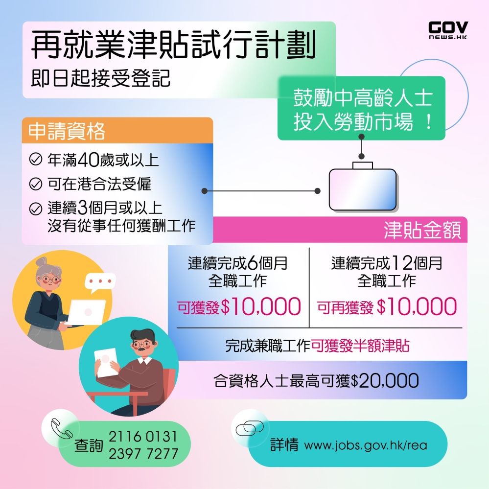 【裁員潮/辭職/遣散/中年再就業/離職攻略/失業/打工仔必知/政府再就業津貼試行計劃/勞工處】香港經濟持續下滑,近日亦有不少企業傳出炒人/裁員的消息,相信不少人在努力搵工當中,勞工處去年年中推出「再就業津貼試行計劃」,宗旨在鼓勵中年人士再就業,成功重投就業市場的朋友,可以申領到2萬元的津貼,想知申請資格、年齡條件、申請方法及津貼發放方法,即入內文睇睇。