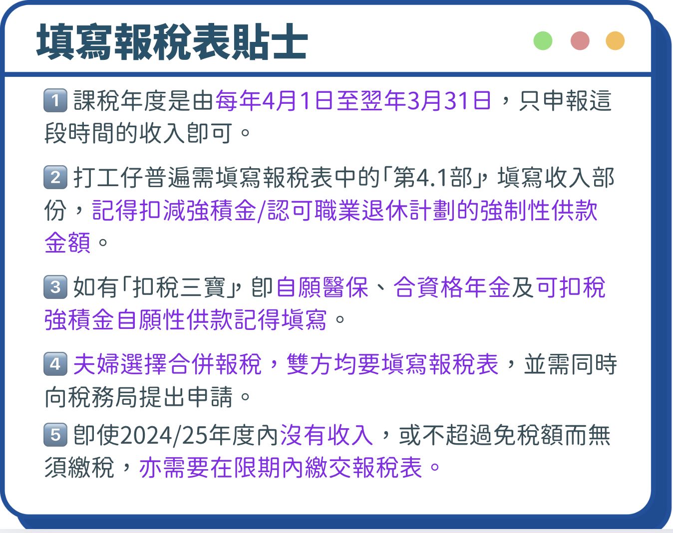 5️⃣ 即使2024/25年度內沒有收入,或不超過免稅額而無須繳稅,亦需要在限期內繳交報稅表