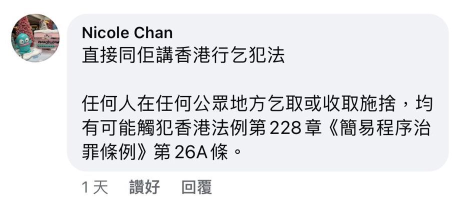 💬「直接同佢講香港行乞犯法,任何人在任何公眾地方乞取或收取施捨,均有可能觸犯香港法例第 228章《簡易程序治罪條例》第26A條。」