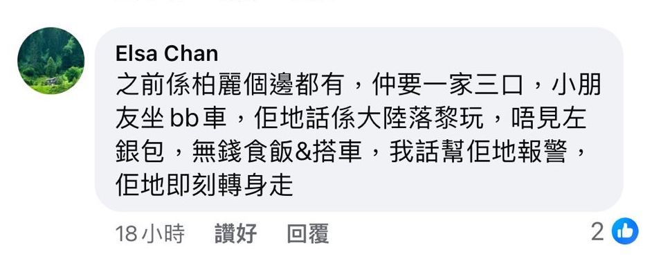 💬「之前係柏麗個邊都有,仲要一家三口,小朋友坐bb車,佢地話係大陸落黎玩,唔見左銀包,無錢食飯&搭車,我話幫佢地報警,佢地即刻轉身走」