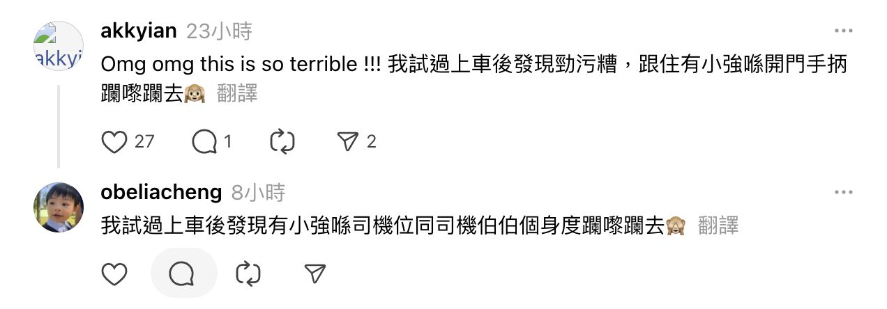 💬「我試過上車後發現勁污糟,跟住有小強喺開門手抦躝嚟躝去」